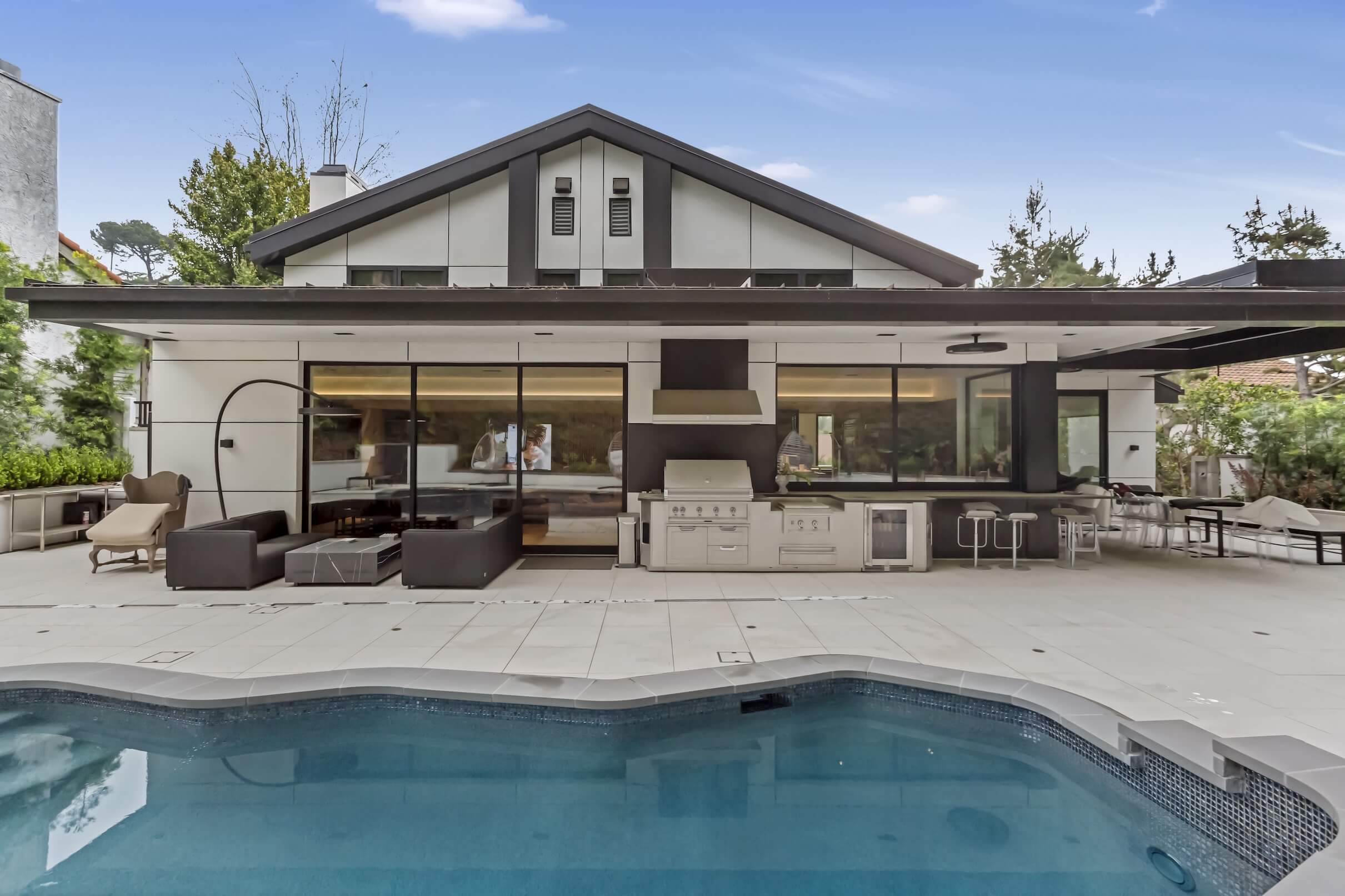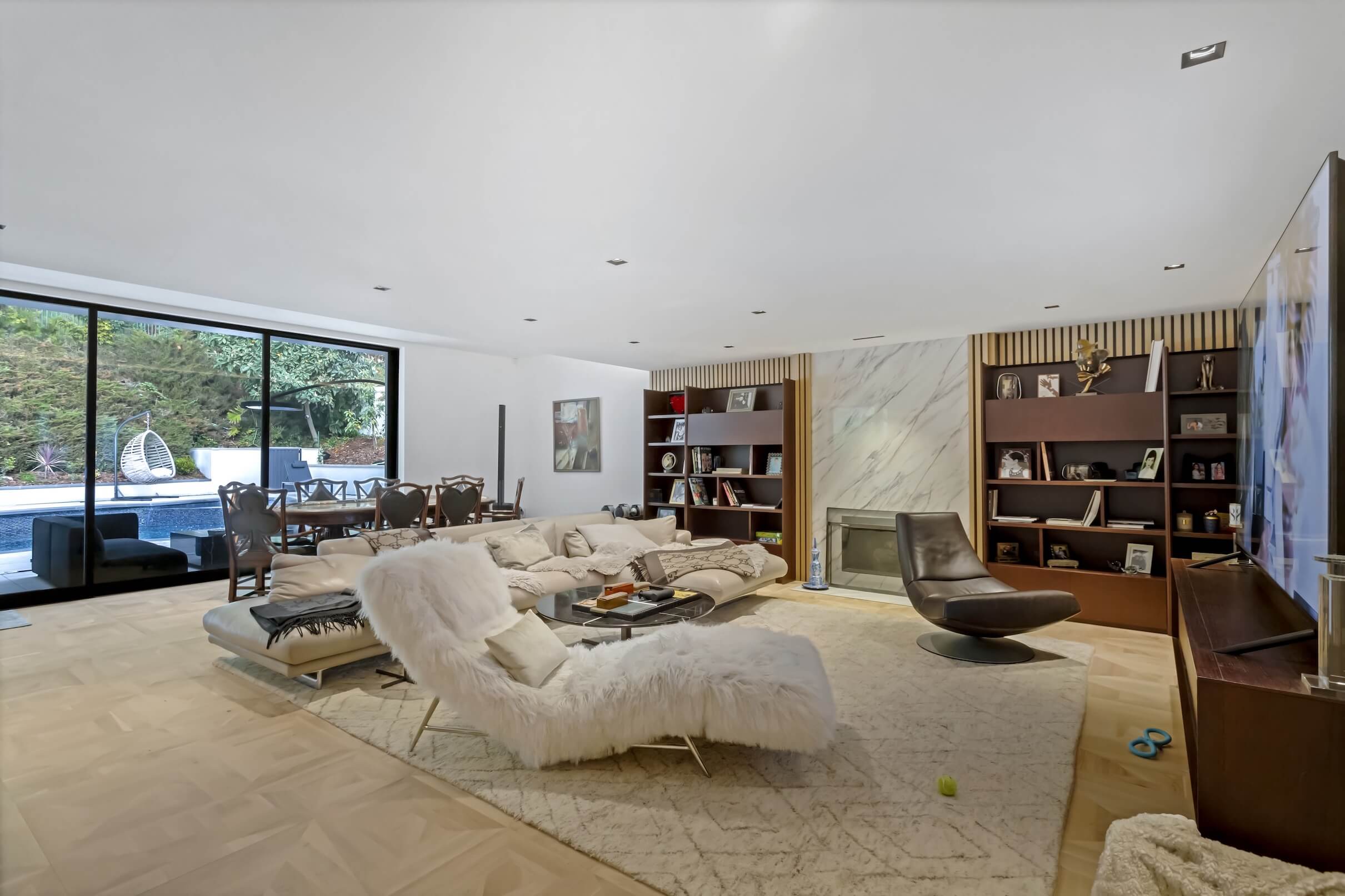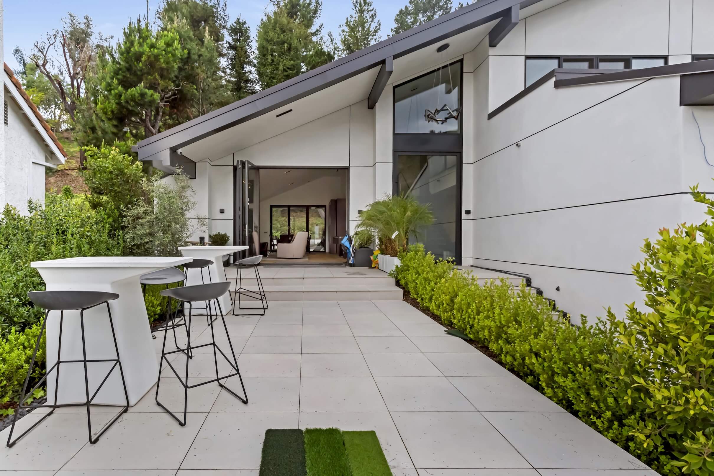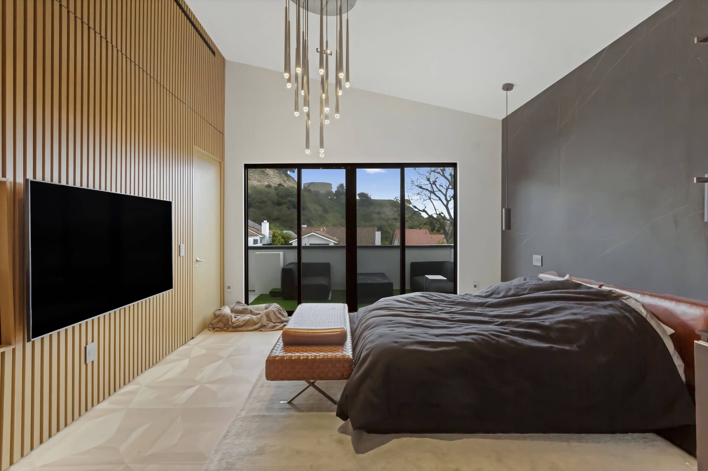 Inside, a steel-stringer stair and glass wine tower rise behind a two-story oak screen, while radiant-heated parquet and slab-marble fireplaces layer warmth against the minimalist shell. The primary suite gains a cantilevered balcony, pocket-door bath and walk-through wardrobe; behind the walls, new shear panels, Cat-6 wiring and an 18-kW solar array future-proof the home. Outside, re-graded slopes now host a salt-water pool, outdoor kitchen and drought-tolerant orchard, stitching family life seamlessly to the hills beyond.