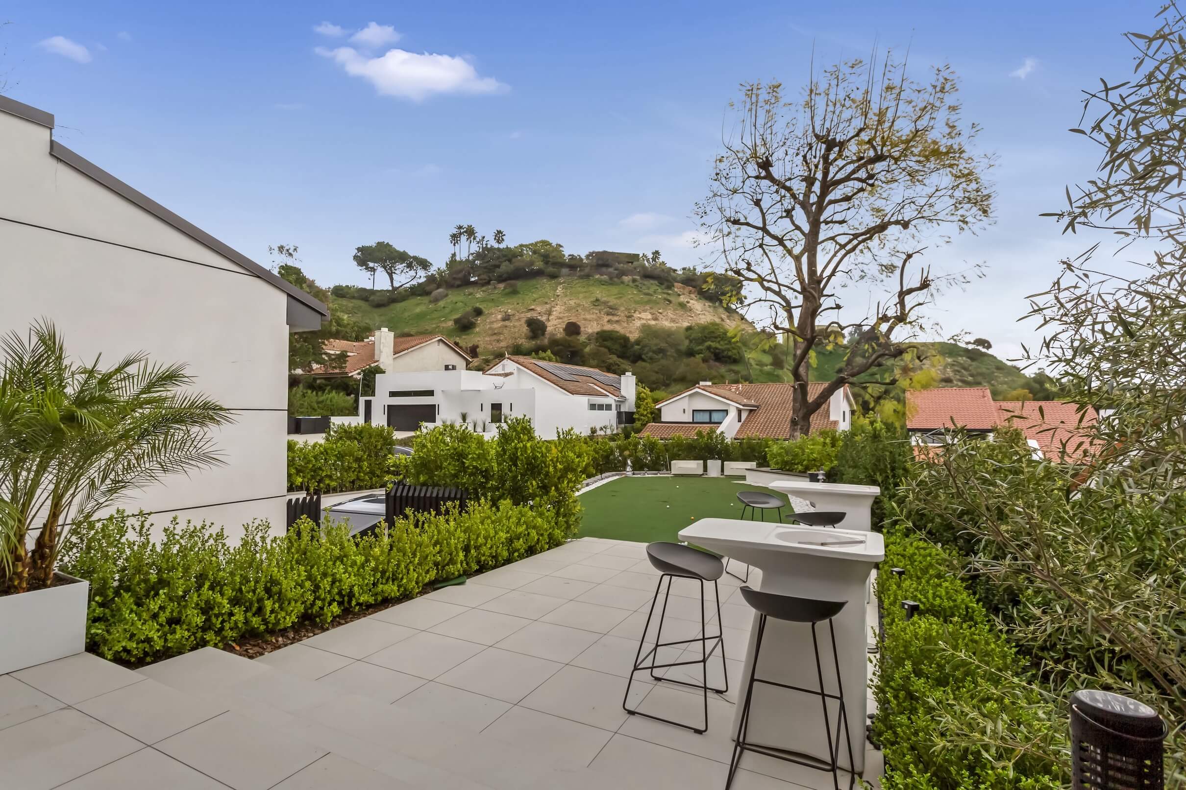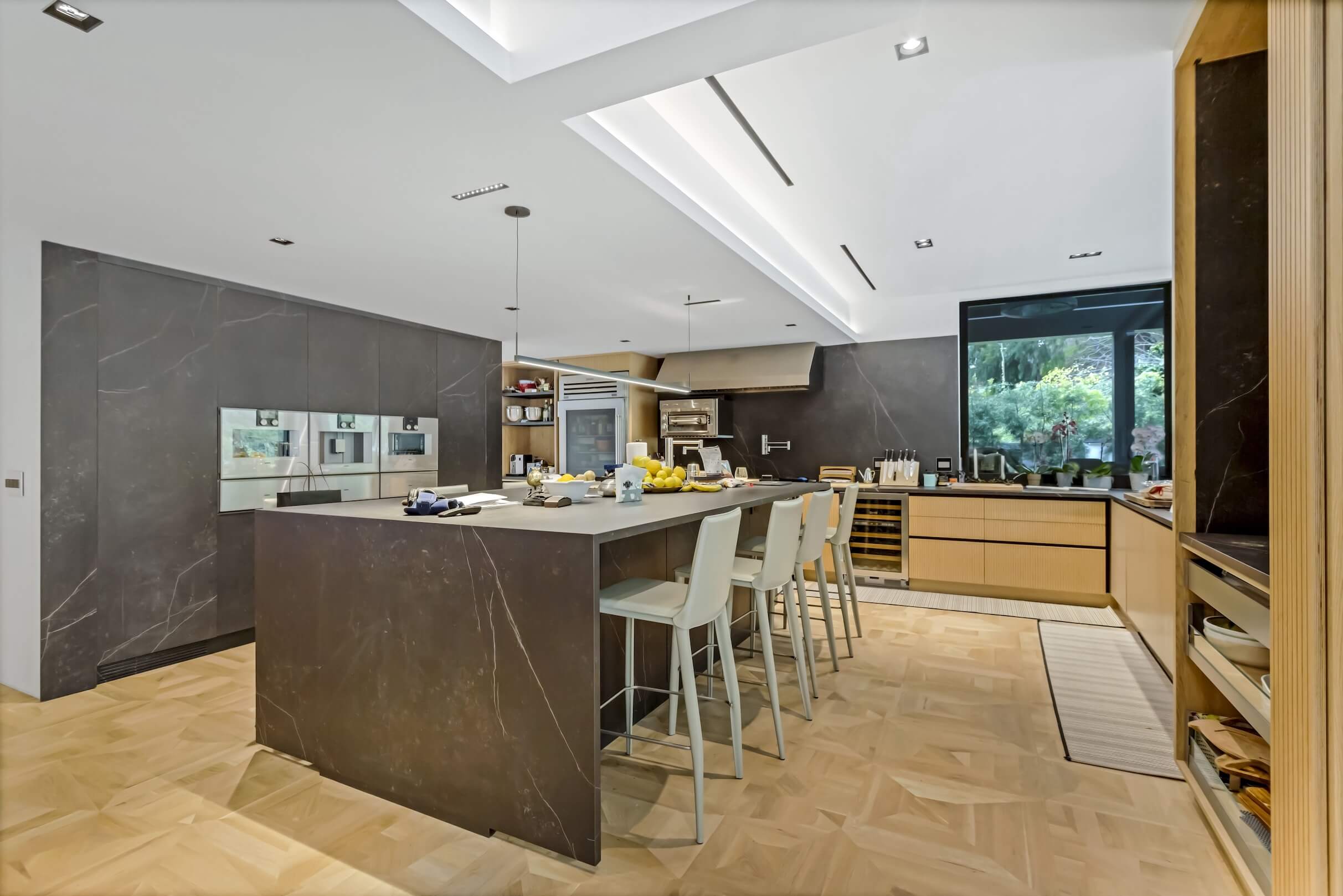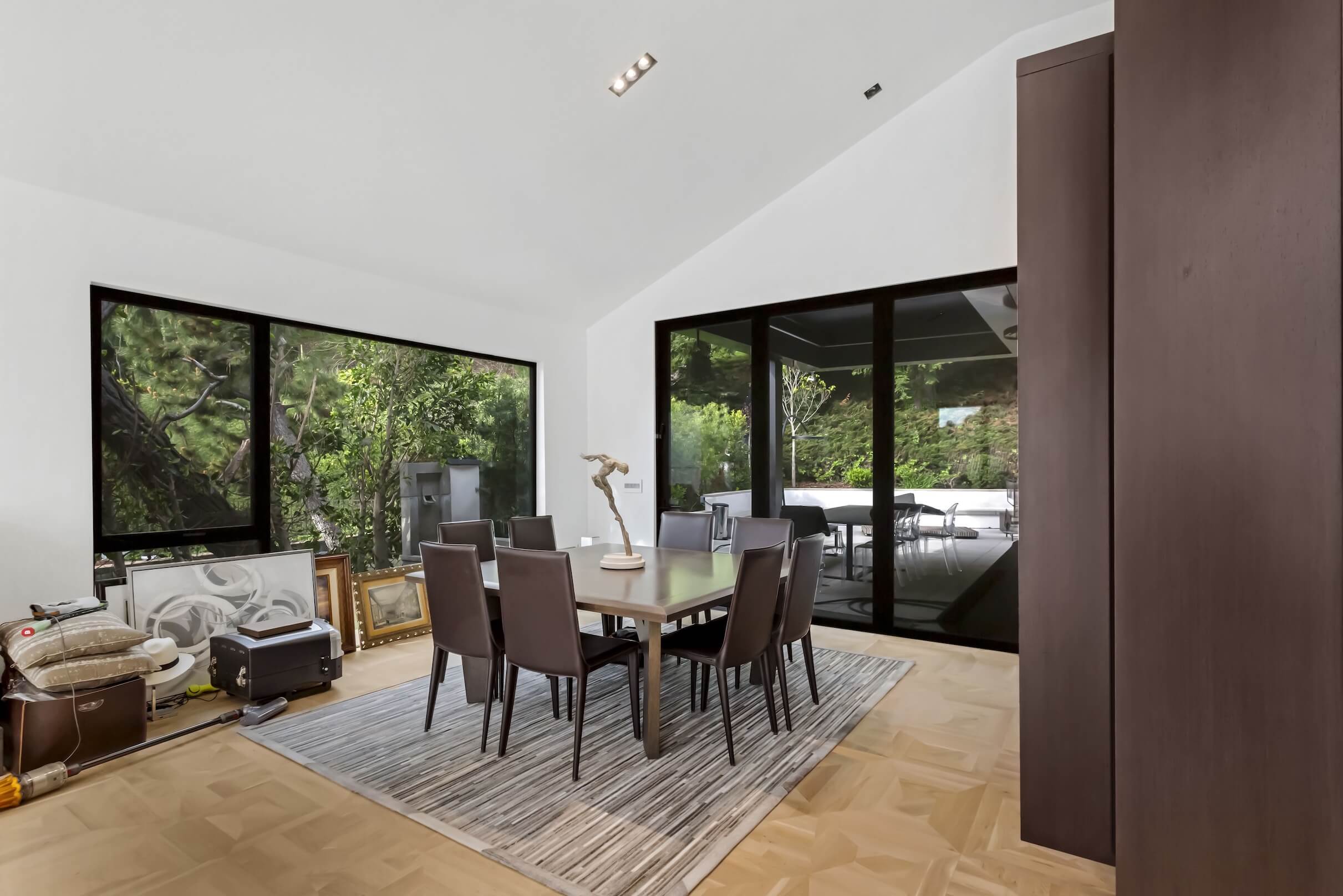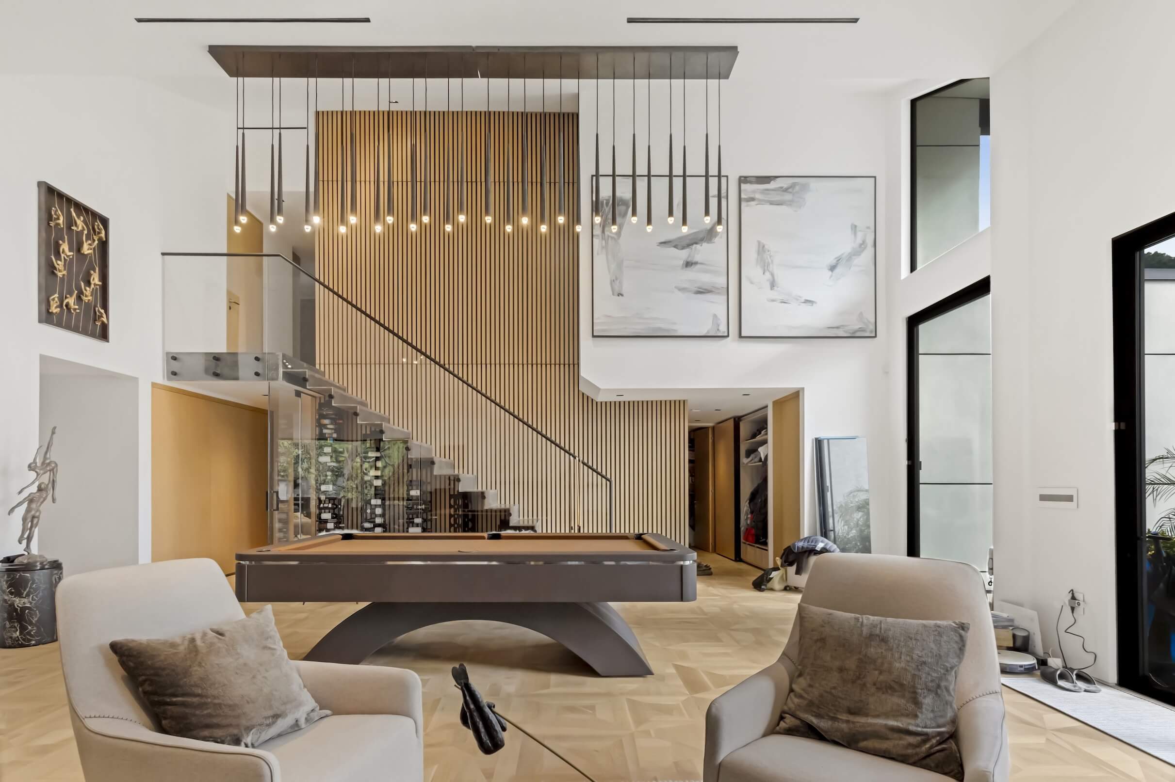 Inside, a steel-stringer stair and glass wine tower rise behind a two-story oak screen, while radiant-heated parquet and slab-marble fireplaces layer warmth against the minimalist shell. The primary suite gains a cantilevered balcony, pocket-door bath and walk-through wardrobe; behind the walls, new shear panels, Cat-6 wiring and an 18-kW solar array future-proof the home. Outside, re-graded slopes now host a salt-water pool, outdoor kitchen and drought-tolerant orchard, stitching family life seamlessly to the hills beyond.