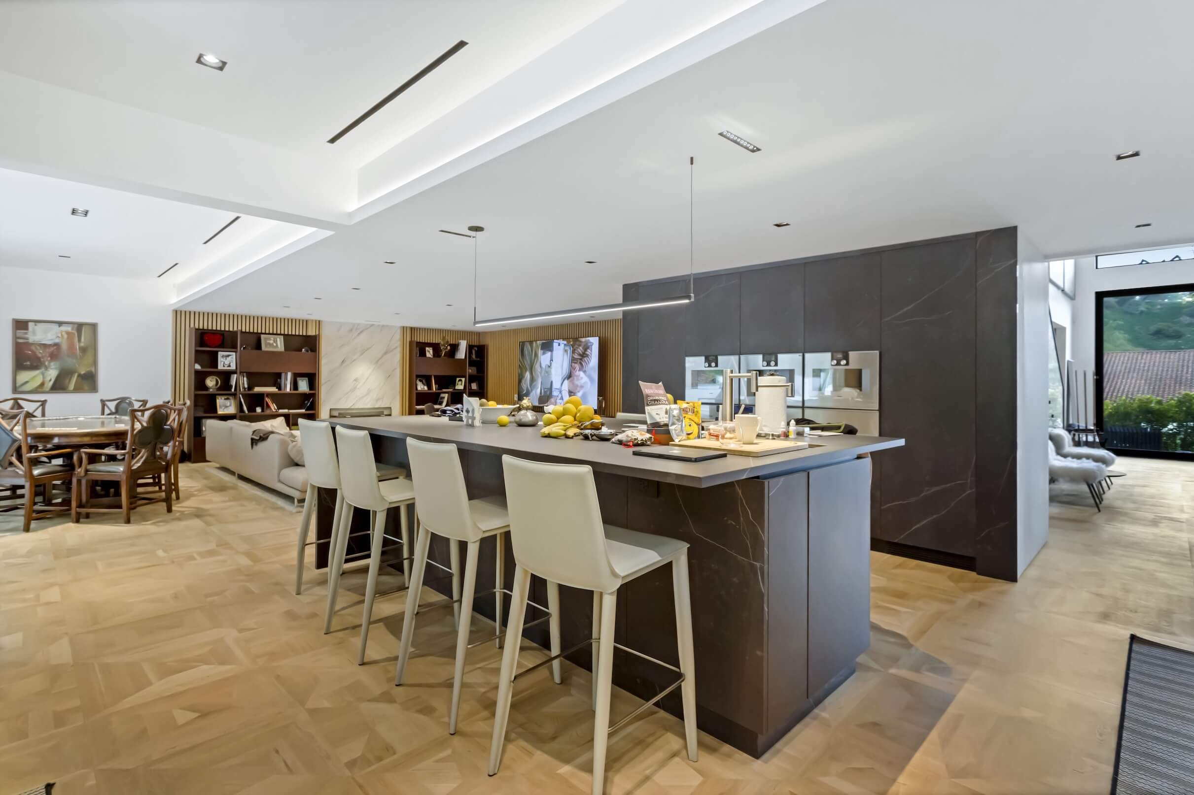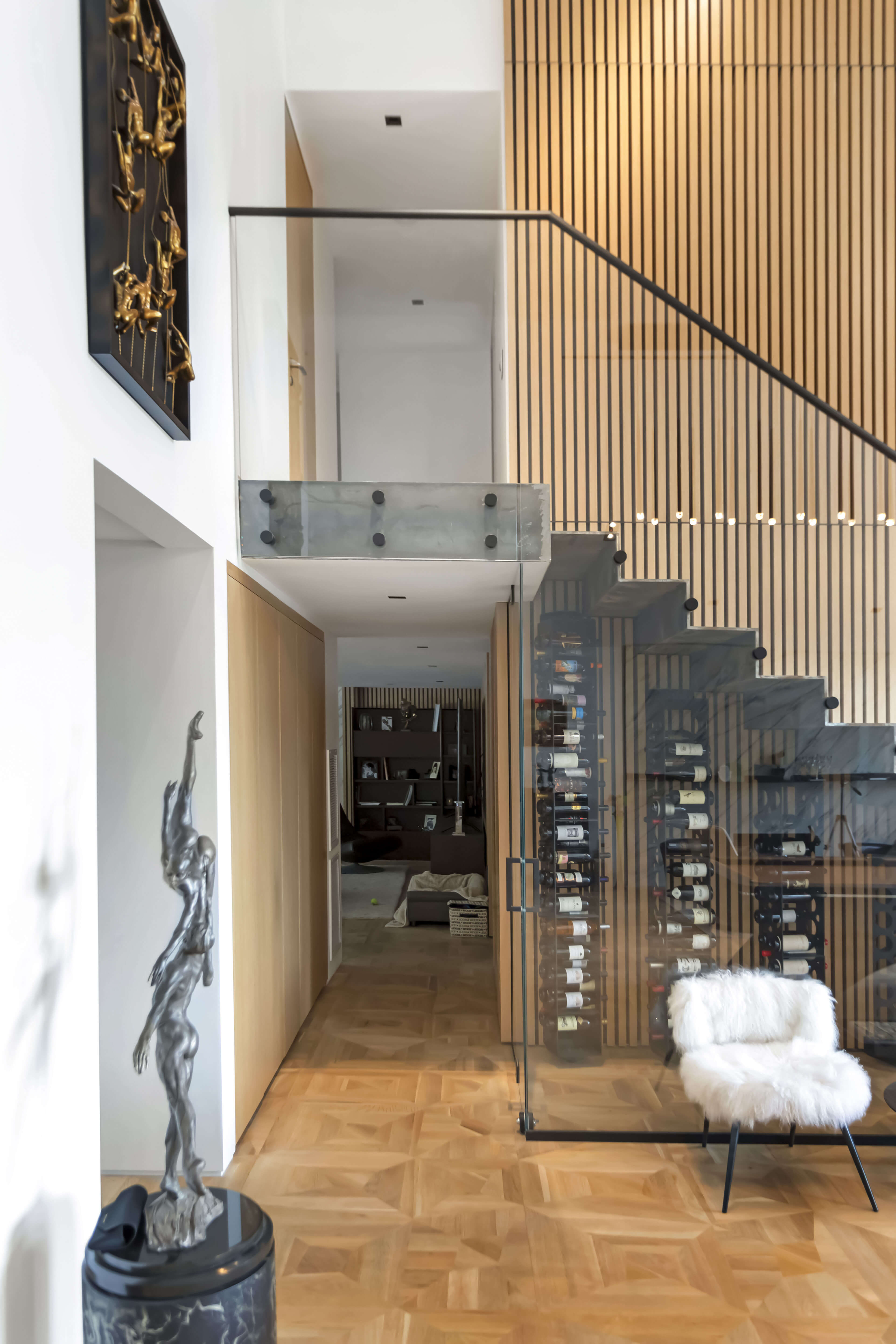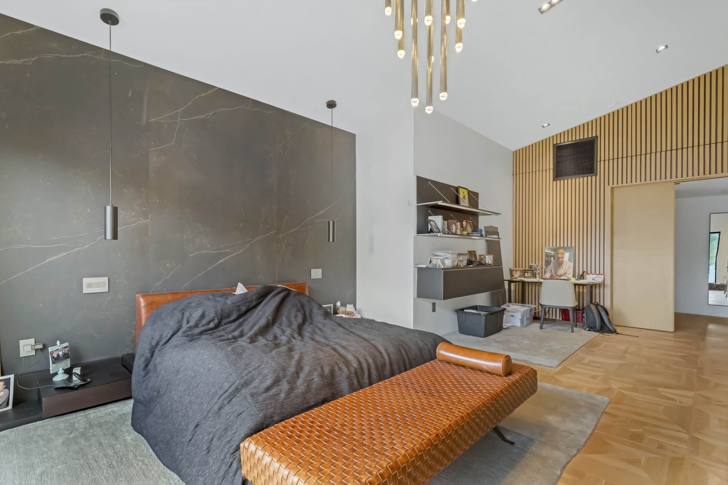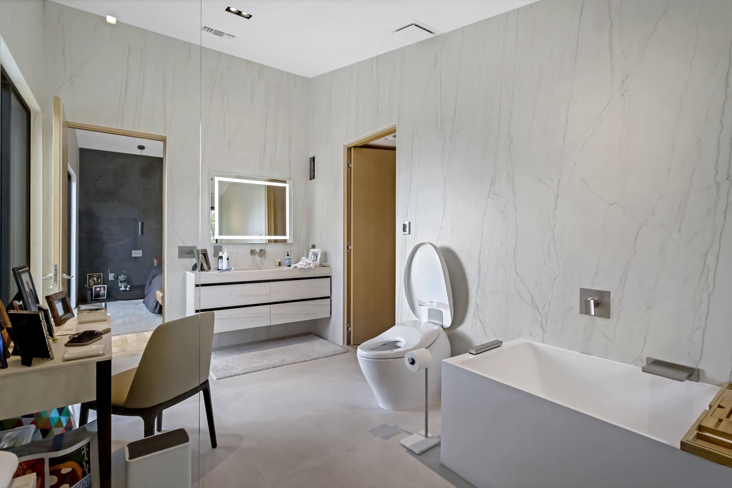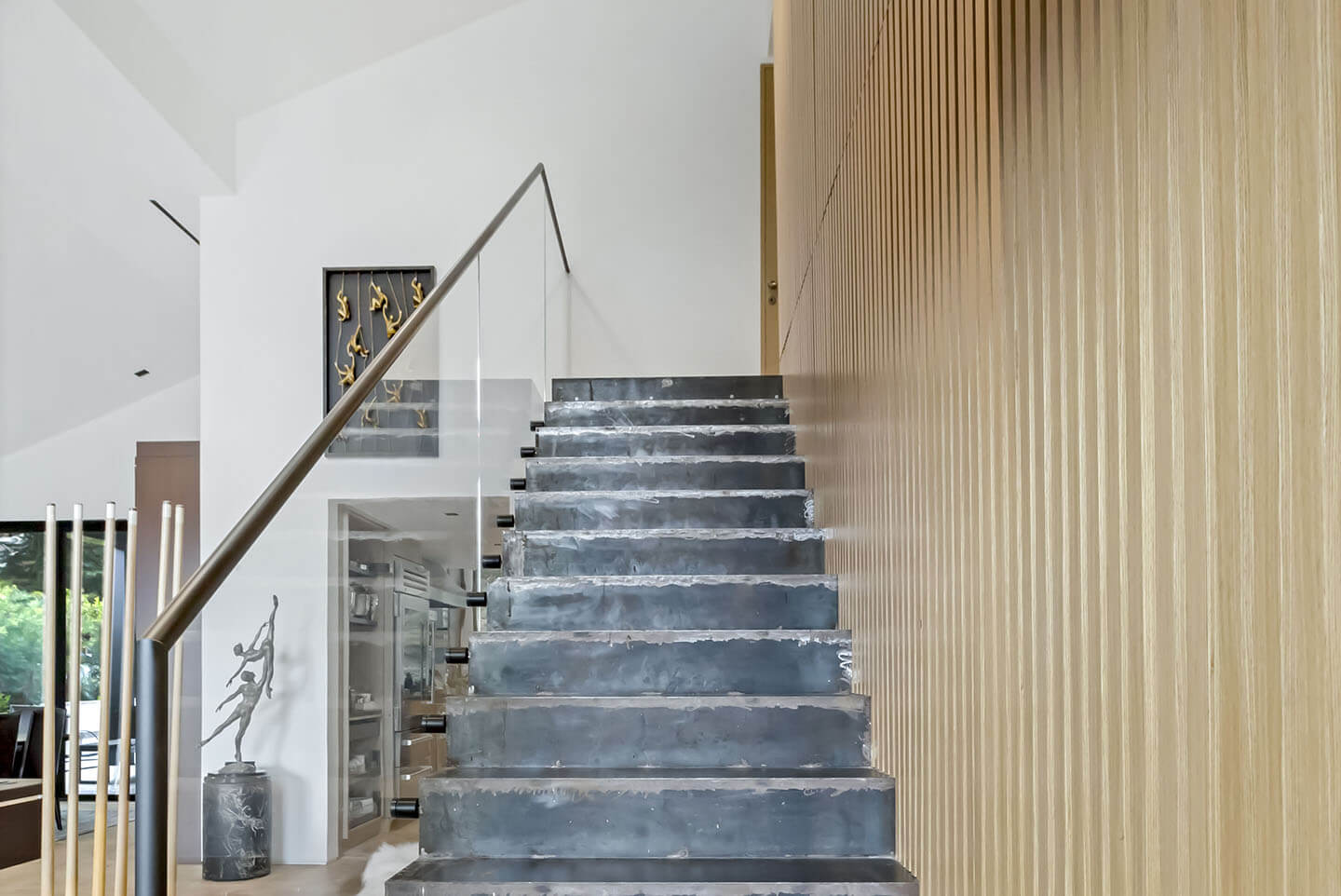 Inside, a steel-stringer stair and glass wine tower rise behind a two-story oak screen, while radiant-heated parquet and slab-marble fireplaces layer warmth against the minimalist shell. The primary suite gains a cantilevered balcony, pocket-door bath and walk-through wardrobe; behind the walls, new shear panels, Cat-6 wiring and an 18-kW solar array future-proof the home. Outside, re-graded slopes now host a salt-water pool, outdoor kitchen and drought-tolerant orchard, stitching family life seamlessly to the hills beyond.