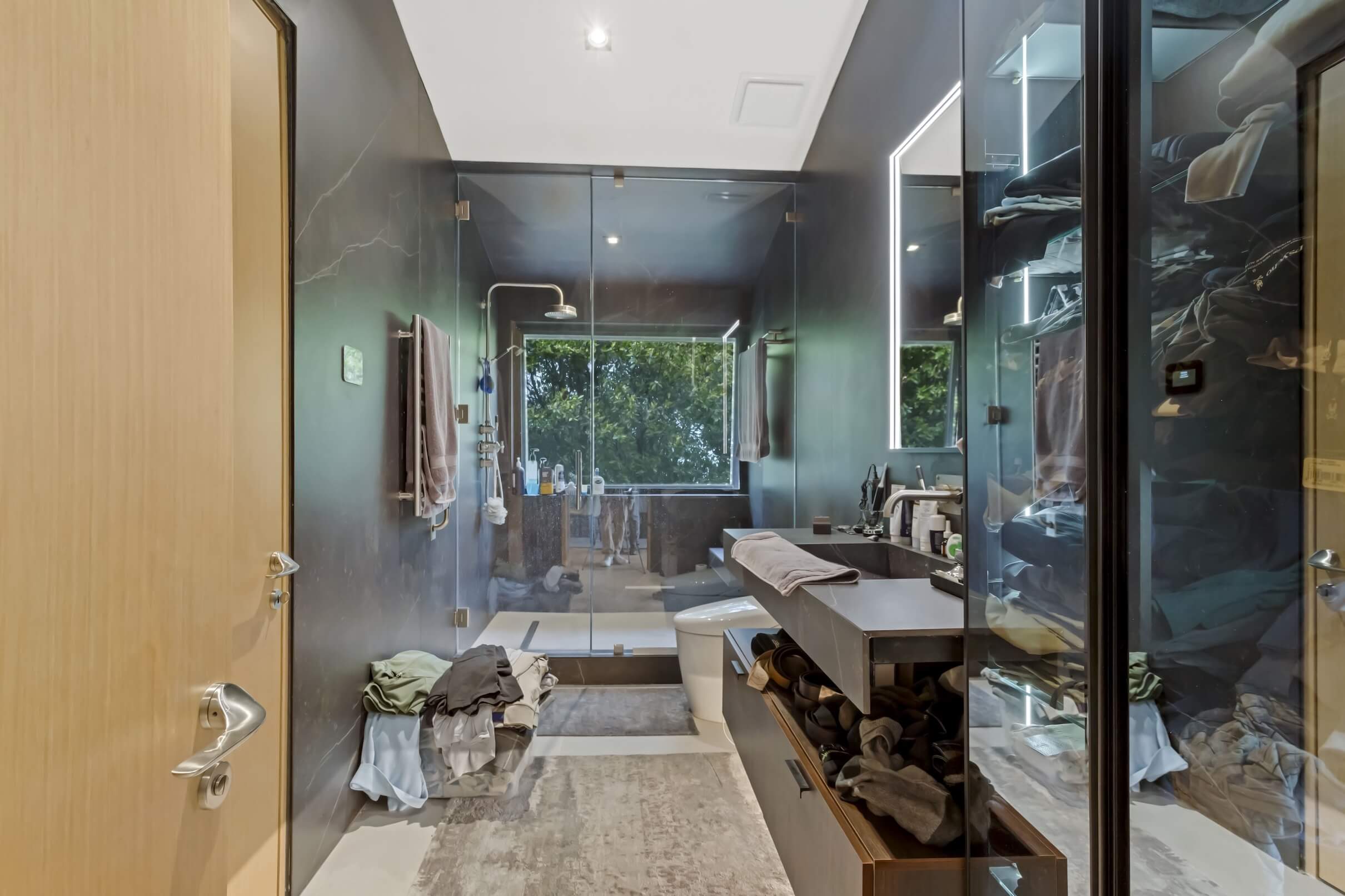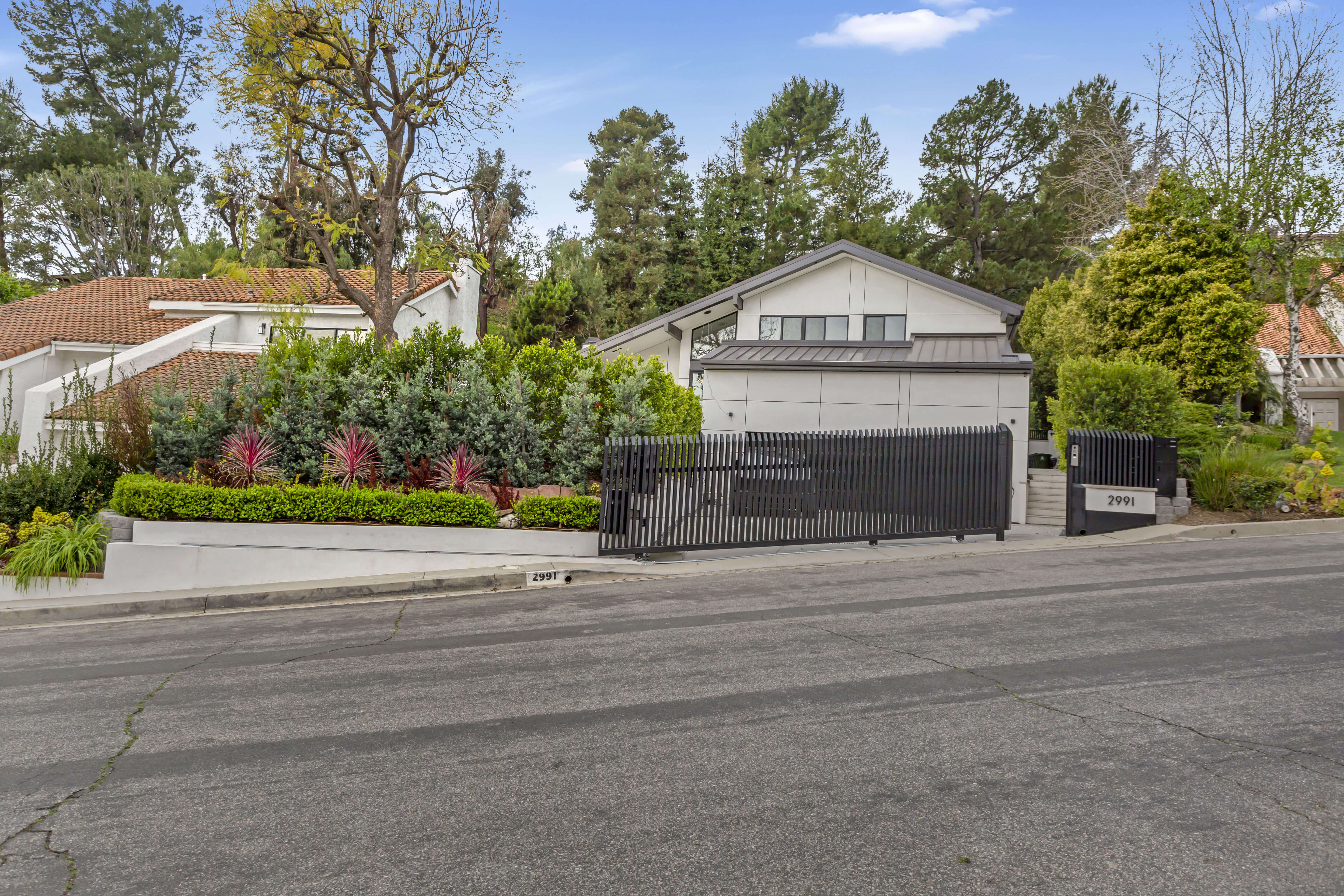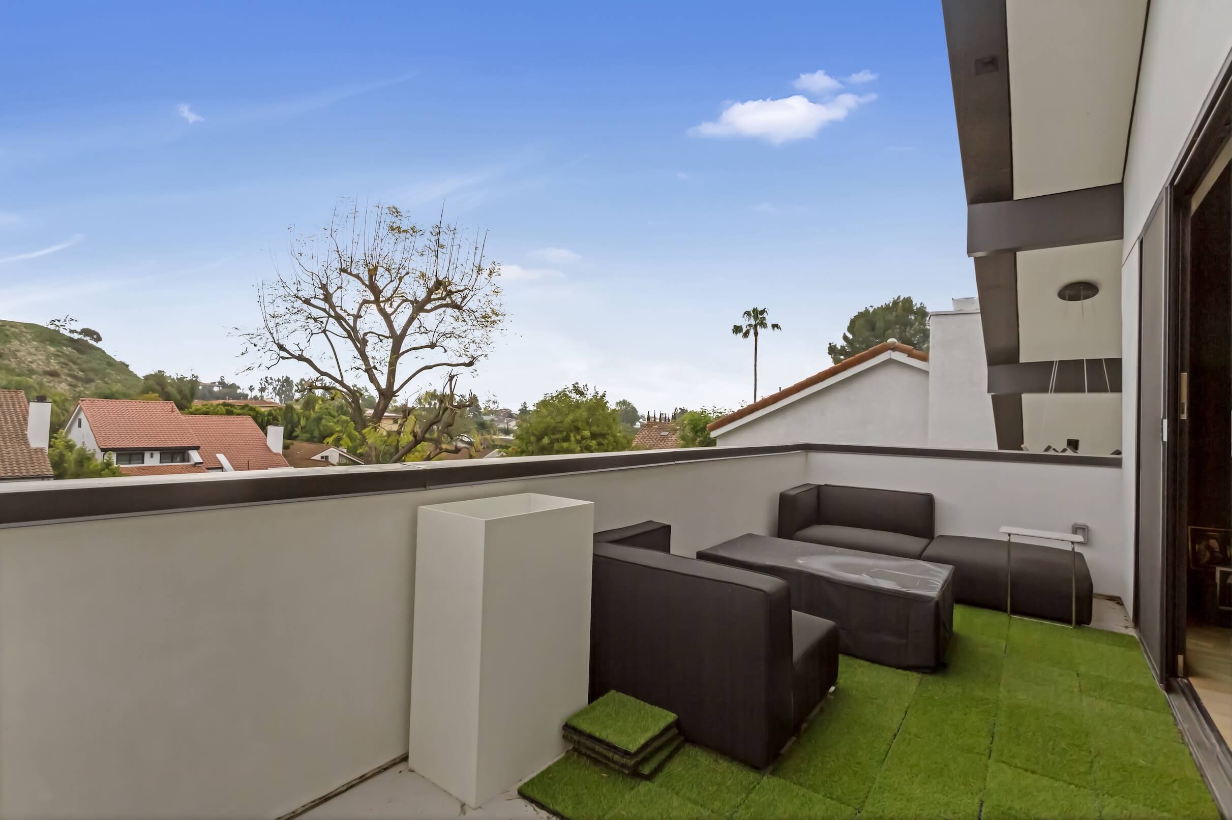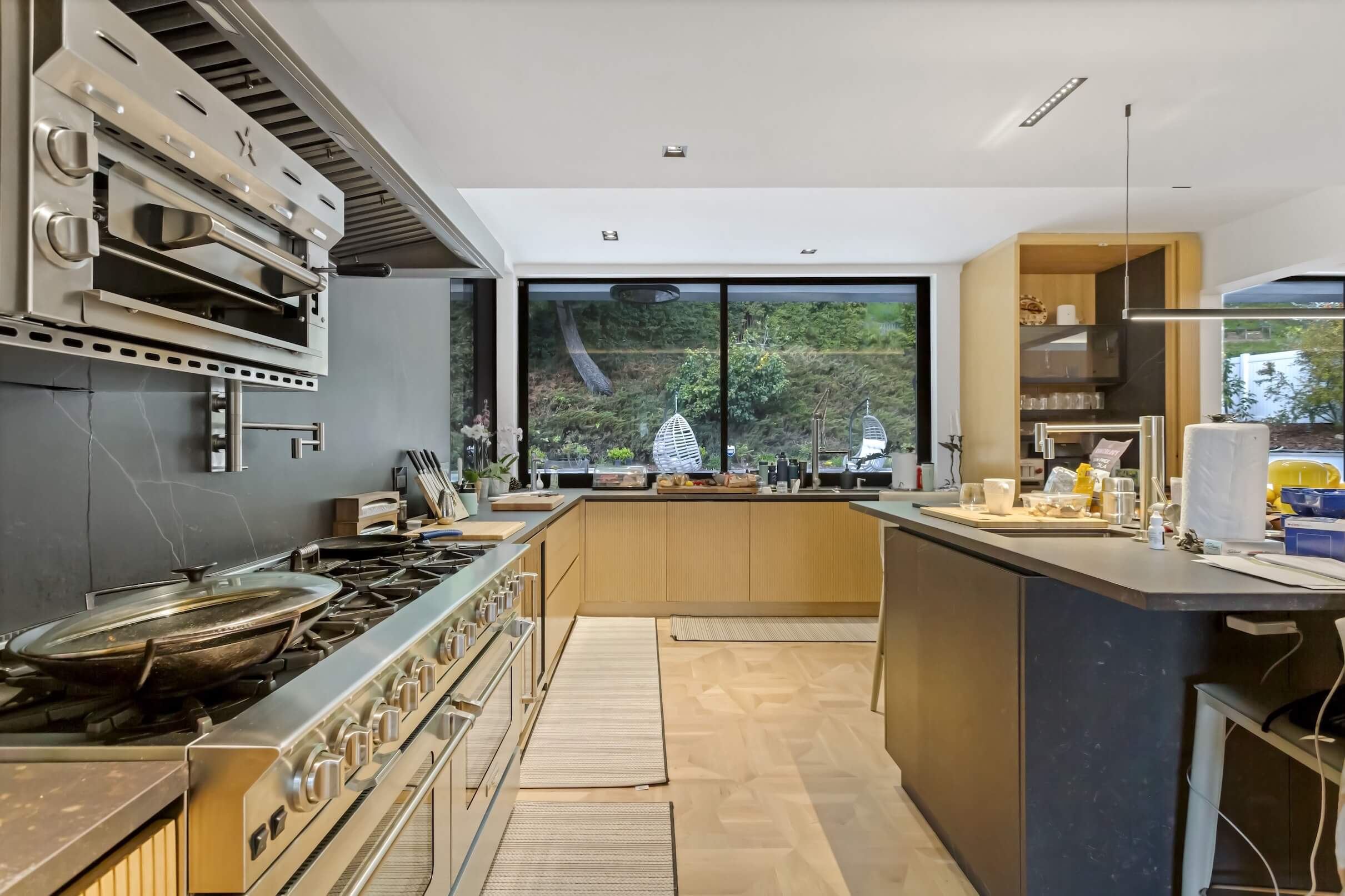 Inside, a steel-stringer stair and glass wine tower rise behind a two-story oak screen, while radiant-heated parquet and slab-marble fireplaces layer warmth against the minimalist shell. The primary suite gains a cantilevered balcony, pocket-door bath and walk-through wardrobe; behind the walls, new shear panels, Cat-6 wiring and an 18-kW solar array future-proof the home. Outside, re-graded slopes now host a salt-water pool, outdoor kitchen and drought-tolerant orchard, stitching family life seamlessly to the hills beyond.