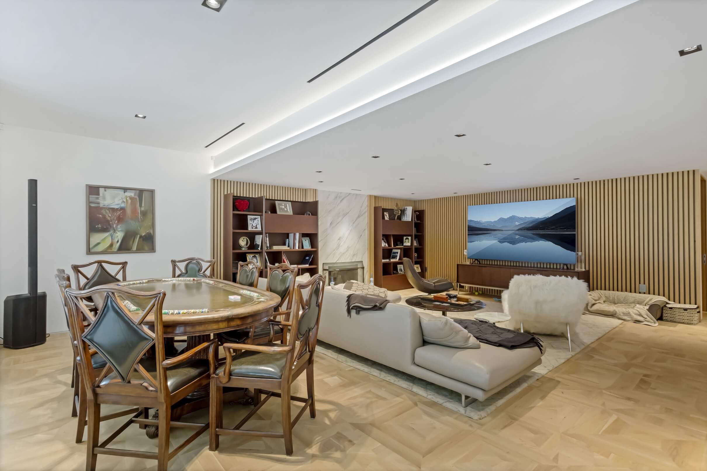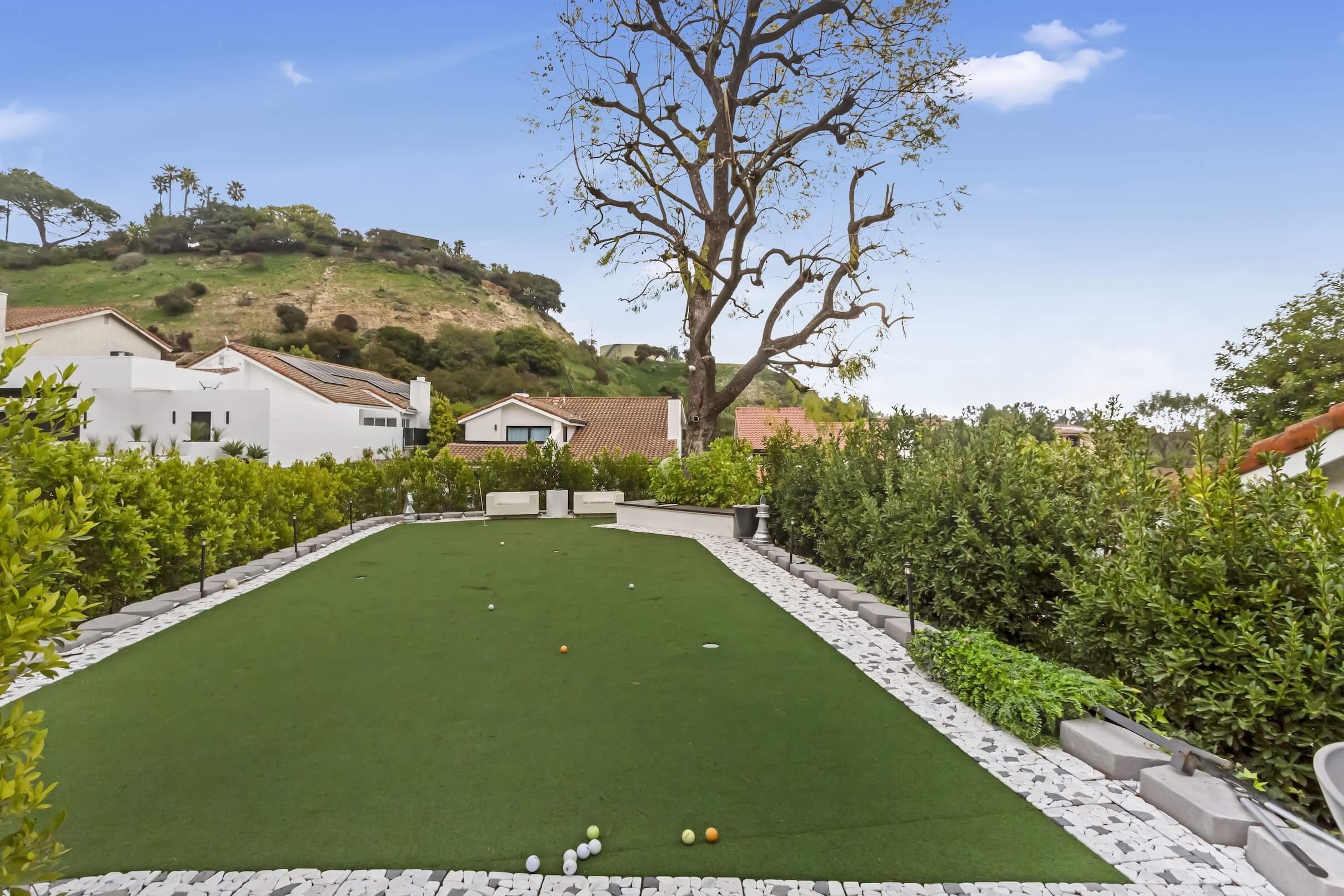 Athena stripped the structure to its studs, cantilevered the living room and kitchen twelve feet into the backyard, and expanded the garage to fit a car lift. Smooth-troweled stucco, bronze-clad window walls and slatted white-oak interiors create a calm, gallery-like core that pivots toward the pool deck and putting green.