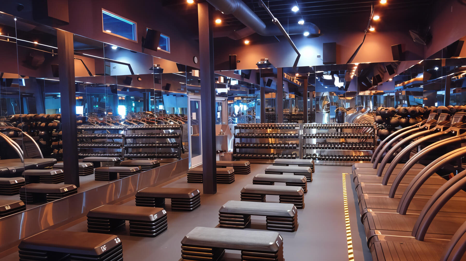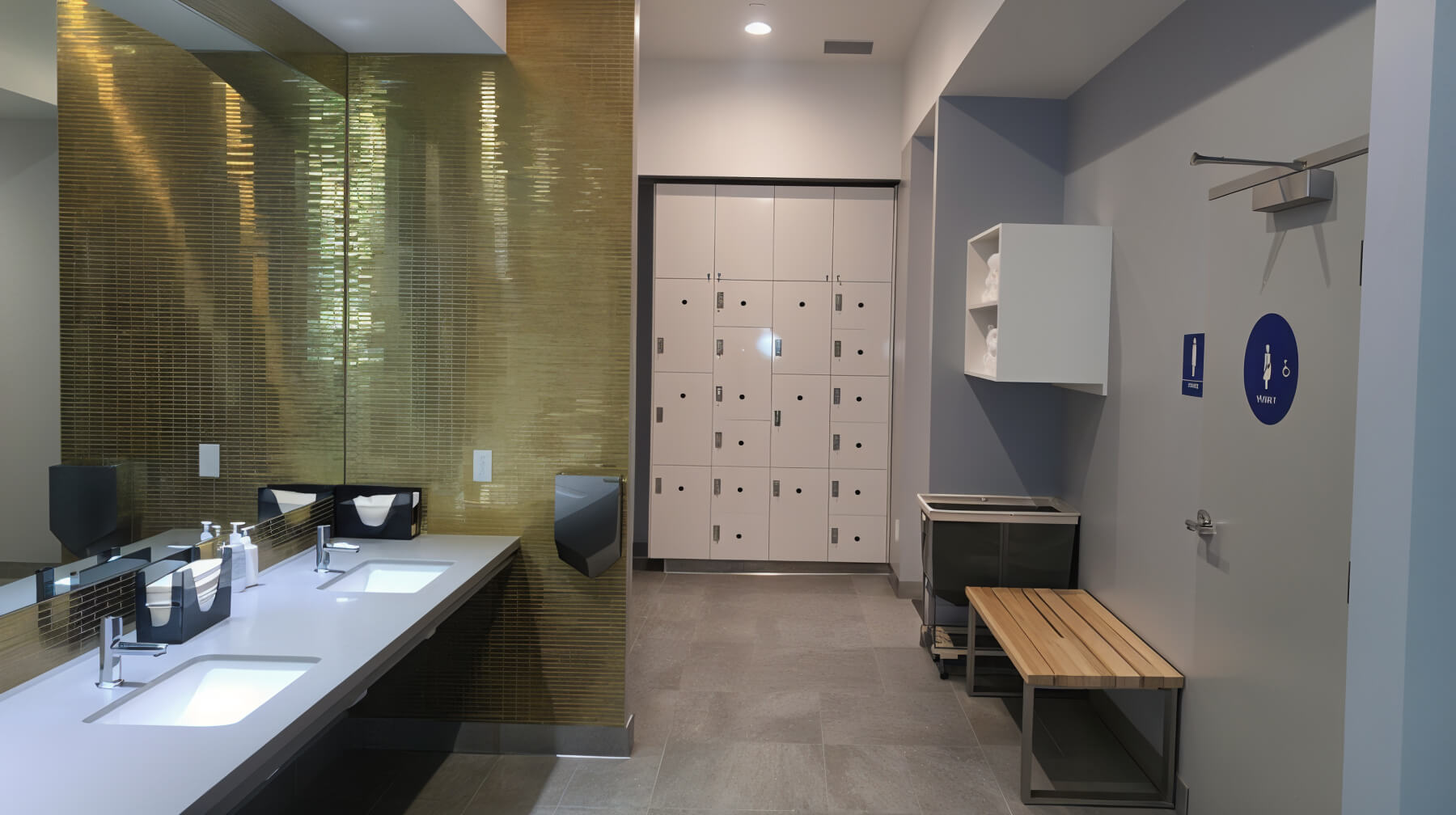 Locker rooms feature metallic mosaic, quartz counters and under-lit frameless mirrors, bringing boutique style with lasting durability. Low-flow fixtures, upgraded plumbing and efficient HVAC trim operating costs while supporting Barry’s green goals. The smoothie bar gained commercial-grade refrigeration and a quartz counter — changes that doubled revenue density. Phased work kept classes active, delivering a 2021 completion on time and budget.