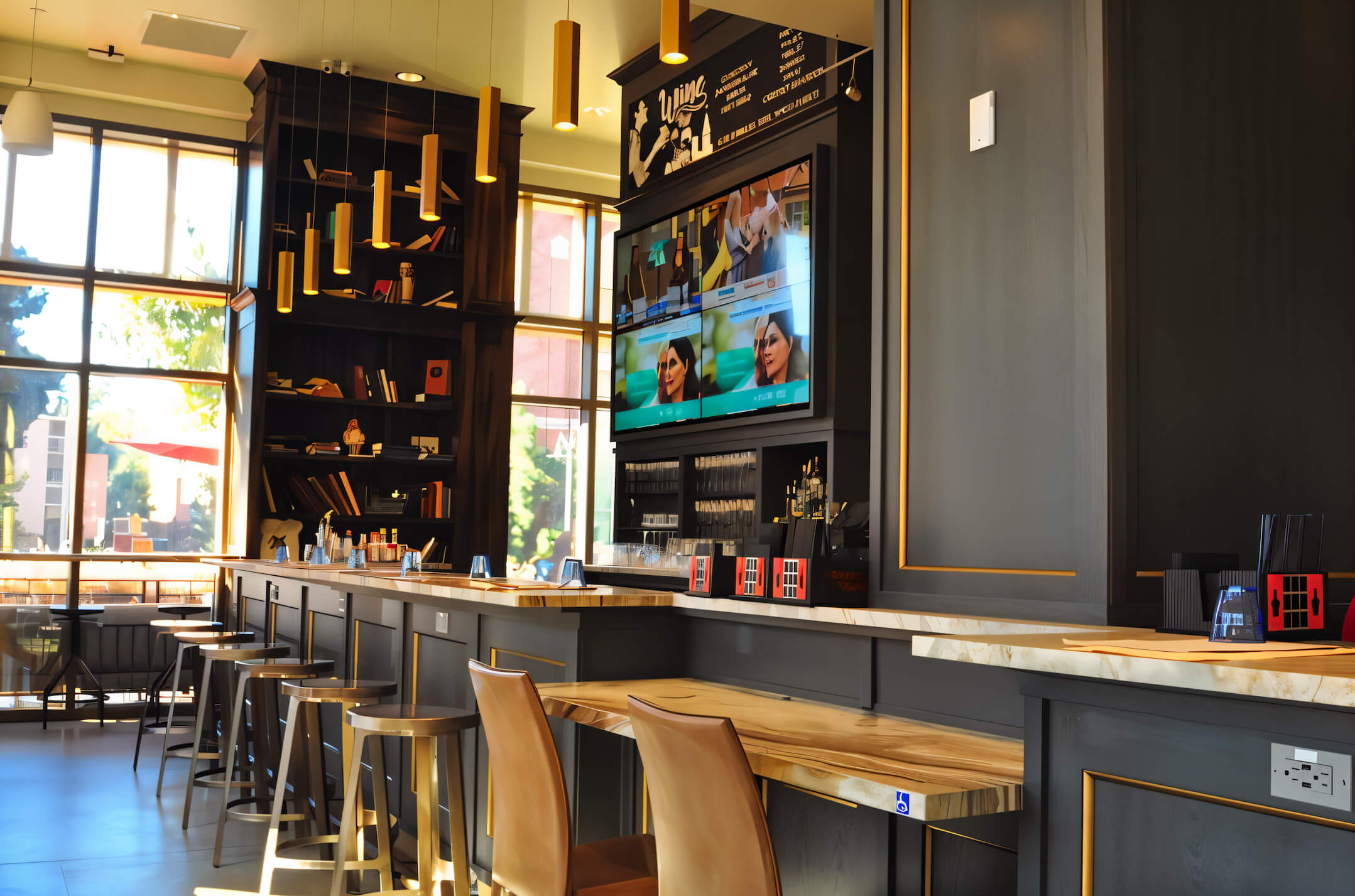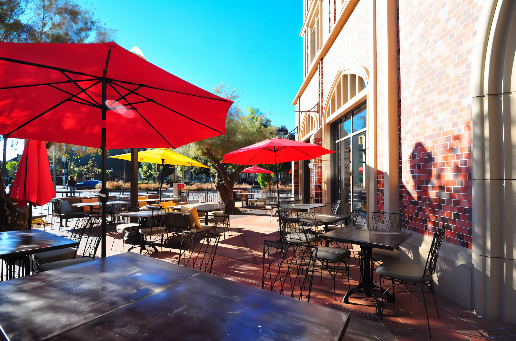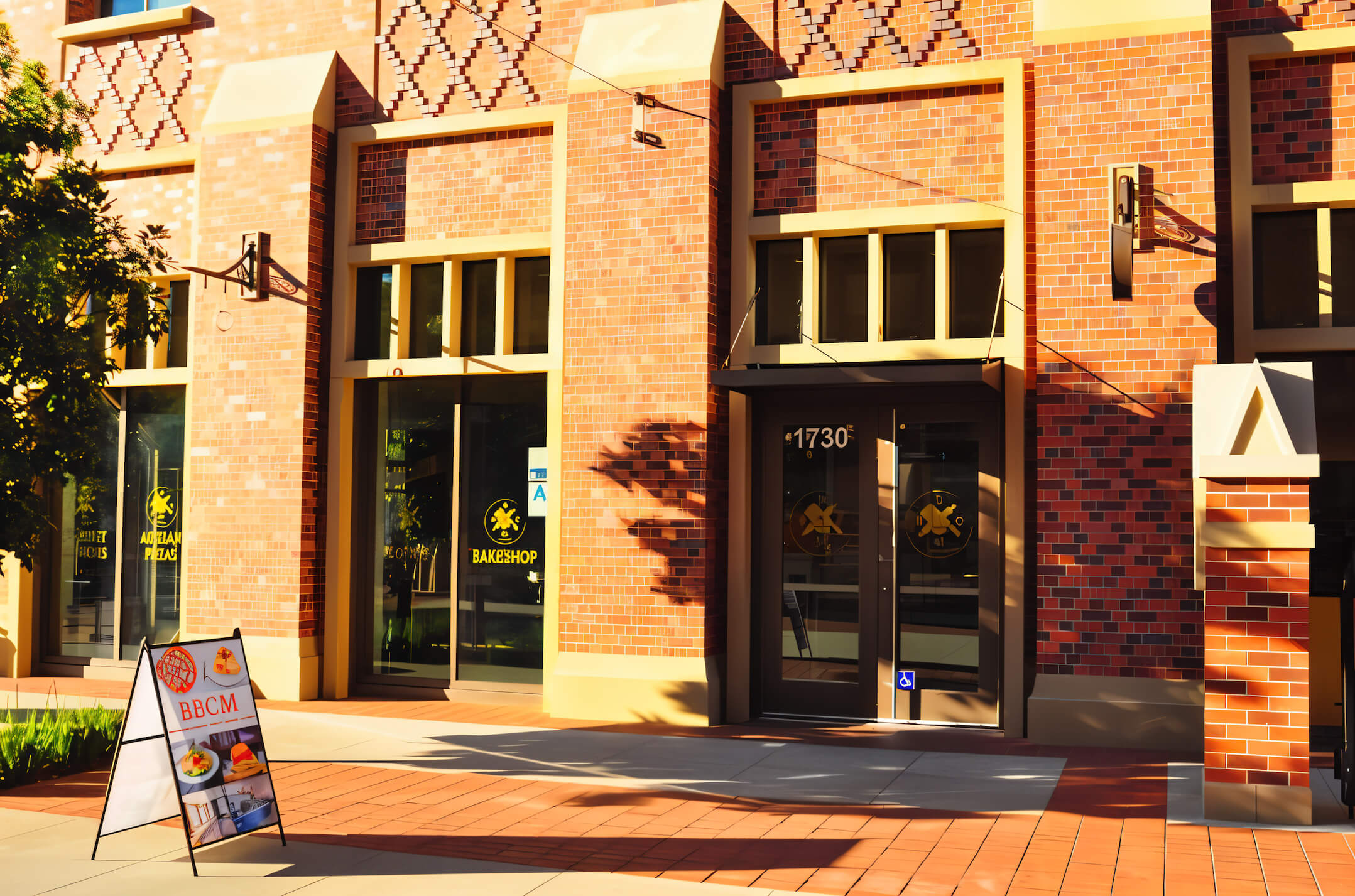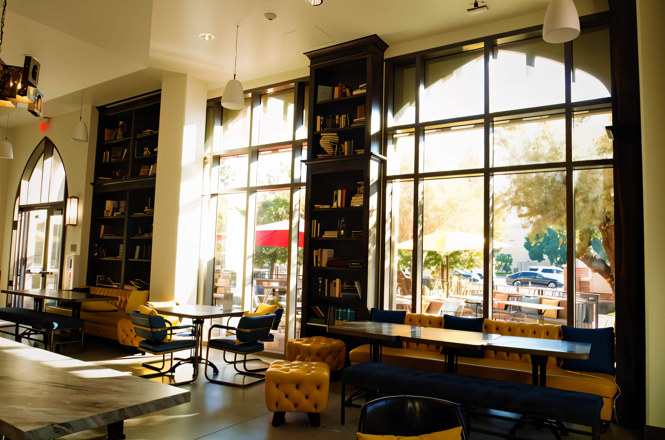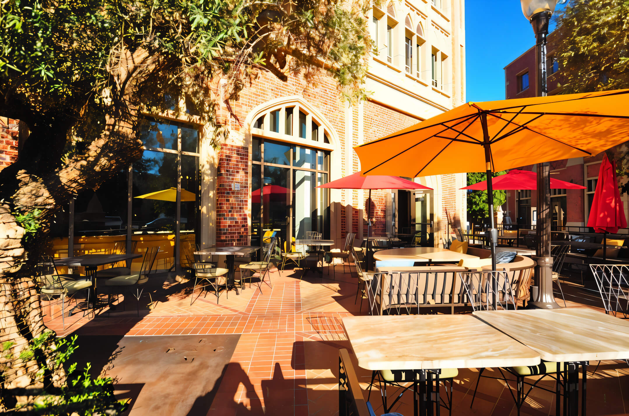 The 5,200 sq ft fit‑out centres on an open‑view kitchen and copper‑clad coffee‑roasting bar — inviting guests to watch every bake, brew and plate. Floor‑to‑ceiling glazing blurs the line between the dining room and a palm‑lined patio, where two 15‑foot heritage olive trees shipped from Northern California anchor the scene. Custom steel windows, terrazzo floors и a quartz‑topped bar echo BBCM’s signature aesthetic while standing up to heavy student traffic.