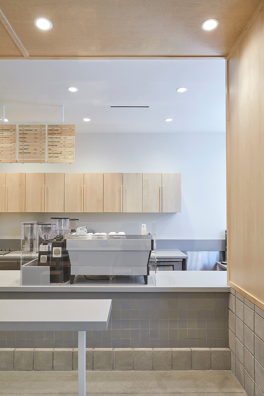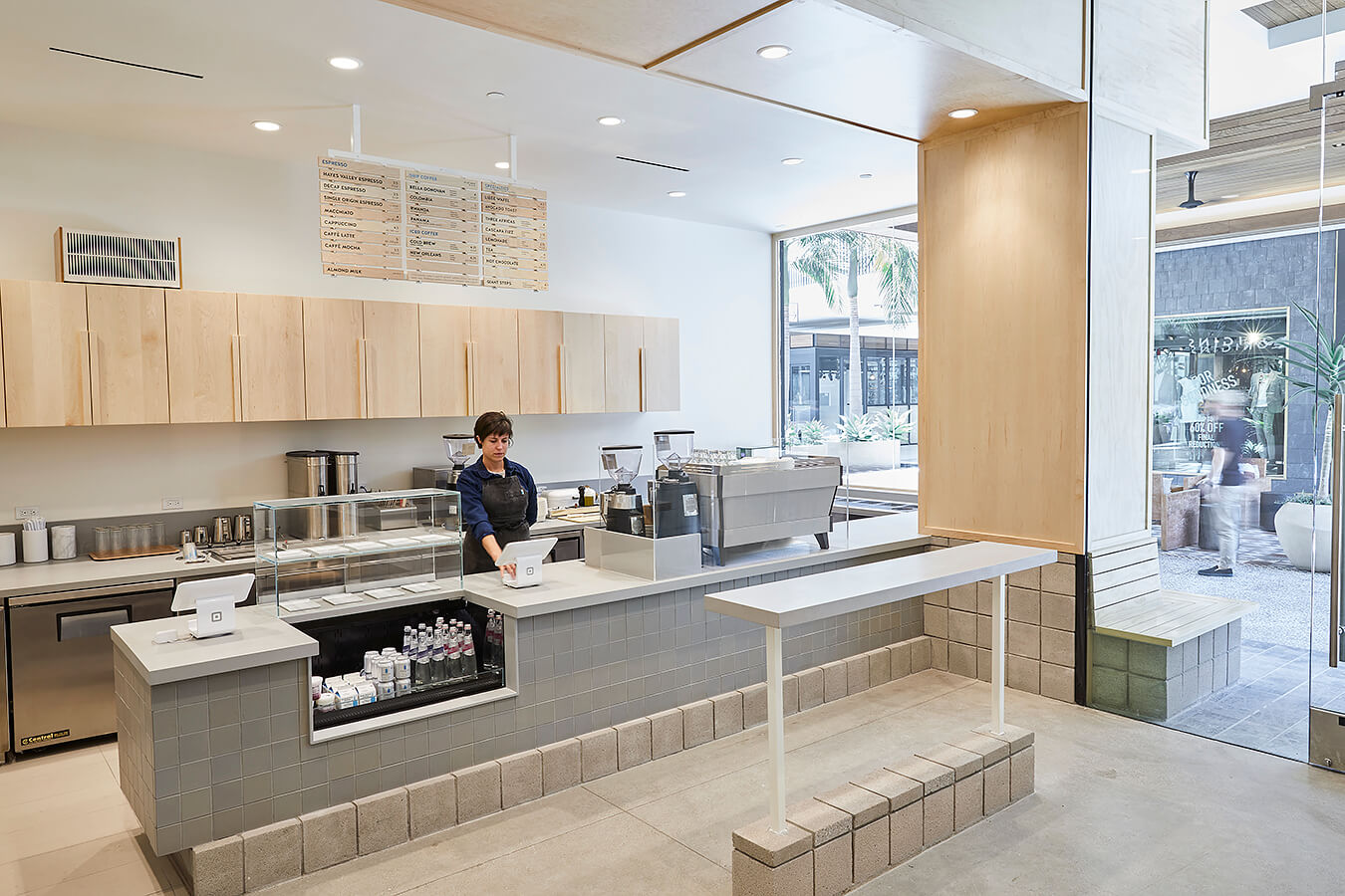 Every detail was value-engineered for speed and durability: prefabricated millwork arrived pre-finished, integrated LED coves eliminate downlight glare, and concealed floor ducts keep power cables out of sight. Passive shading from the mall’s overhang reduces solar gain, allowing the café to meet Title 24 energy targets without additional film or blinds. Completed in just eight weeks and certified with zero punch-list items, the Century City outpost became a pilot for Blue Bottle’s next wave of Southern California roll-outs.