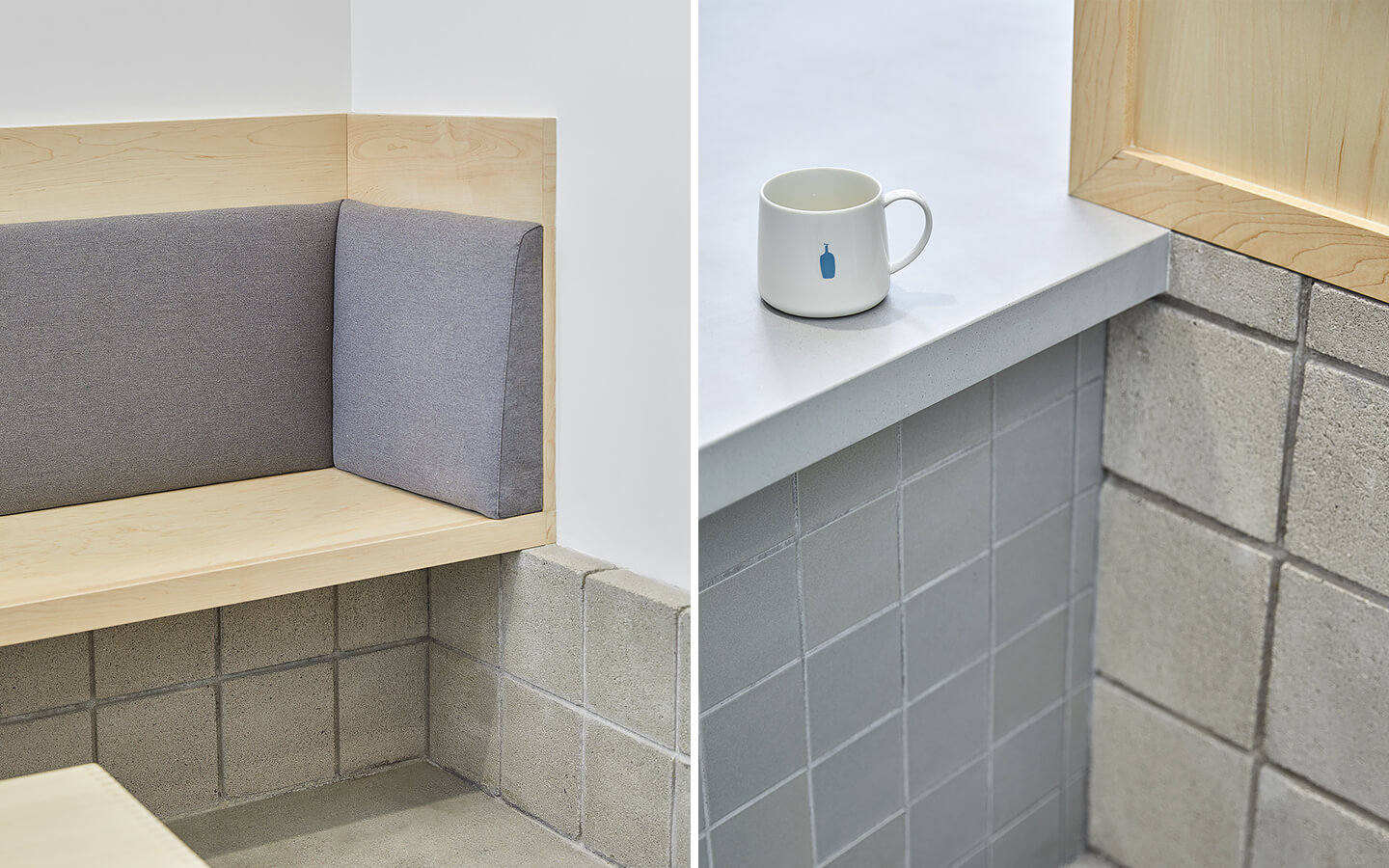 Within a compact footprint, Athena delivered a jewel-box fit-out that marries precision with warmth. A continuous blond-ply band forms soffit, fascia and counter — framing the cobalt Blue Bottle mark. Low-iron glass erases the line between café and concourse, while grey ceramic blocks anchor benches and planters. Back-of-house is hidden behind seamless maple cabinetry, leaving the Marzocco and pastry case centre-stage. The result — a calm, acoustically balanced refuge amid retail bustle.