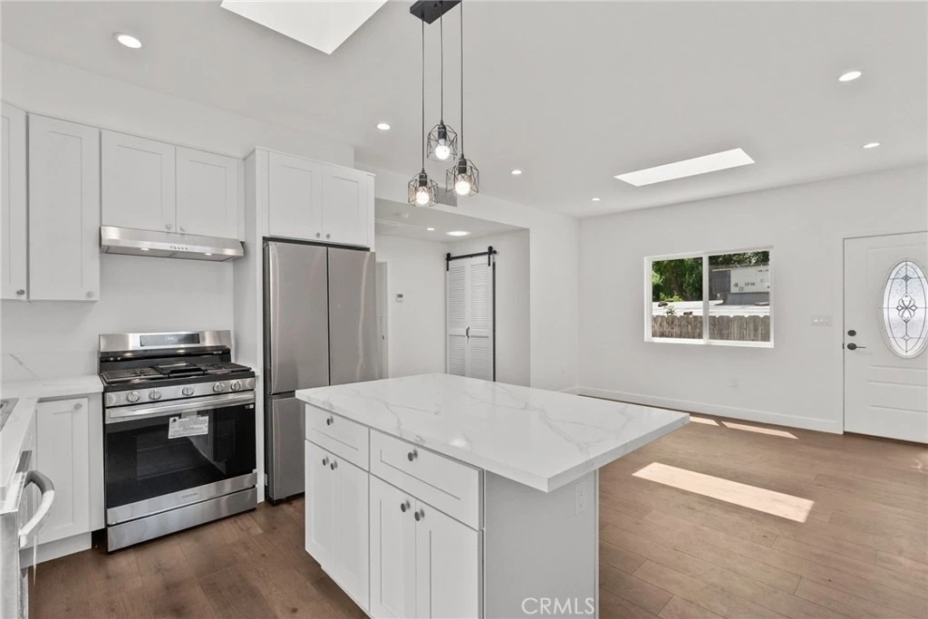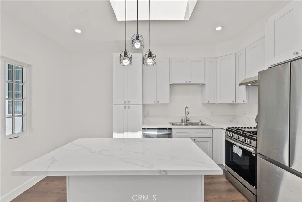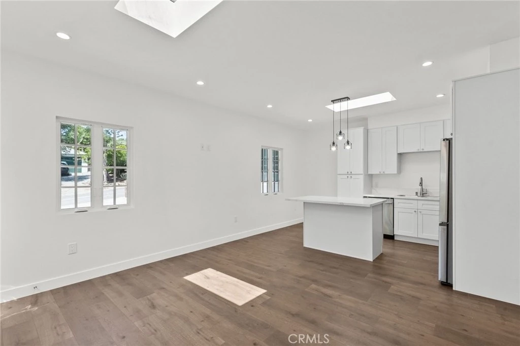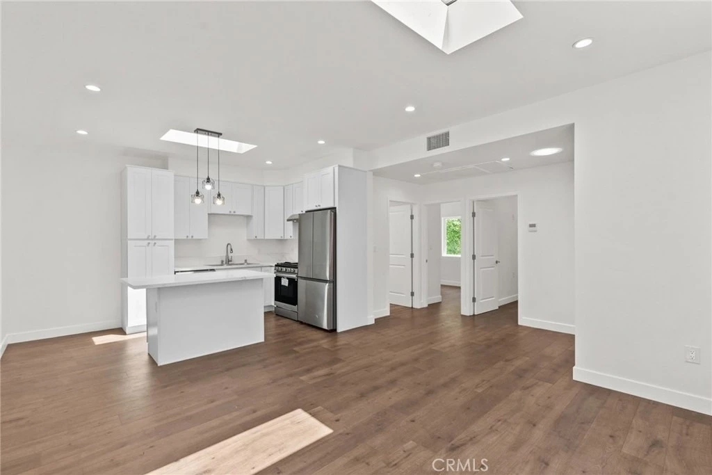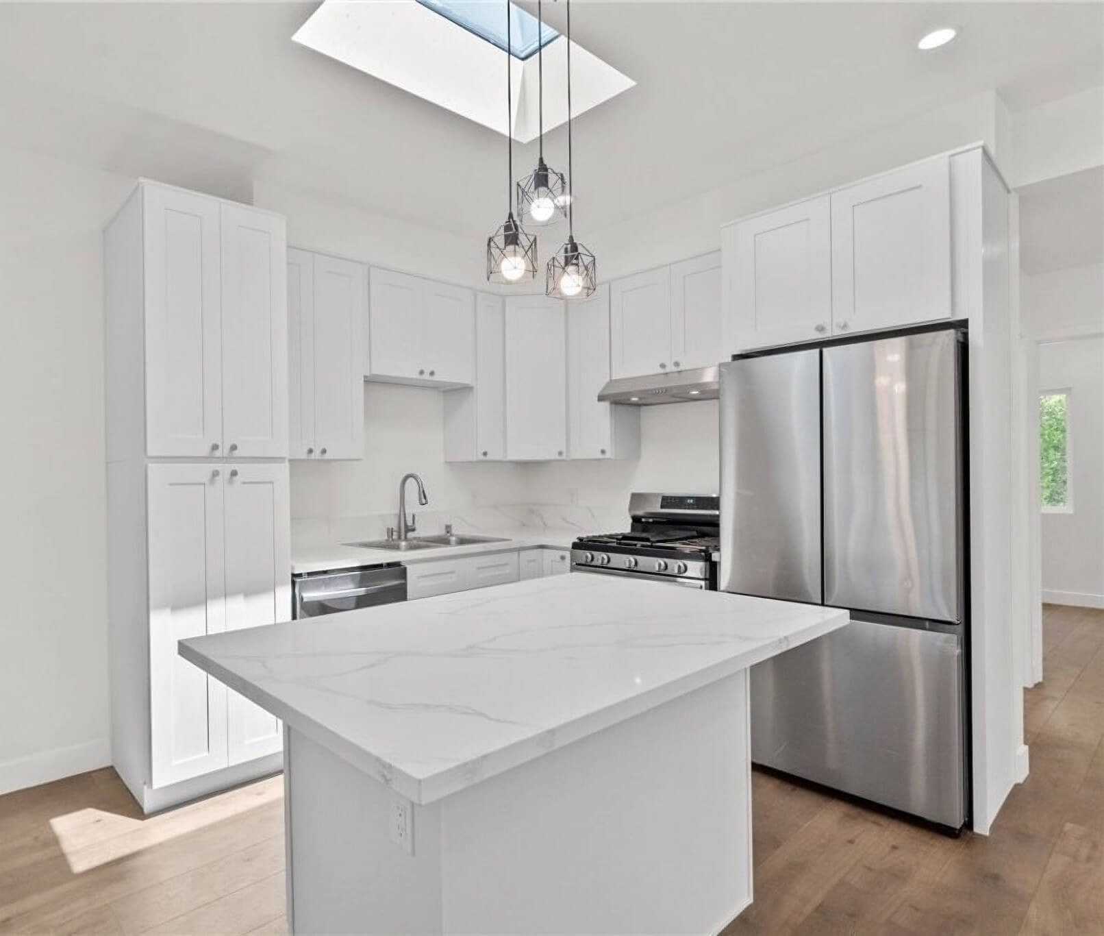 Inside, lofty ceilings, double-pane windows and two skylights flood the open plan with light, while a stone-topped kitchen anchors the space with stainless appliances and abundant shaker cabinetry. Wide-plank LVP floors flow through two tranquil bedrooms, each with full-height closets, and into a hex-tiled bath featuring a frameless glass shower and sculptural back-lit mirror.