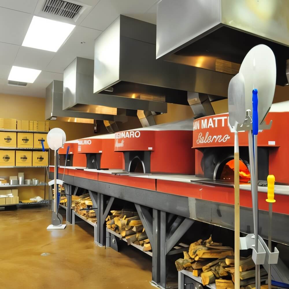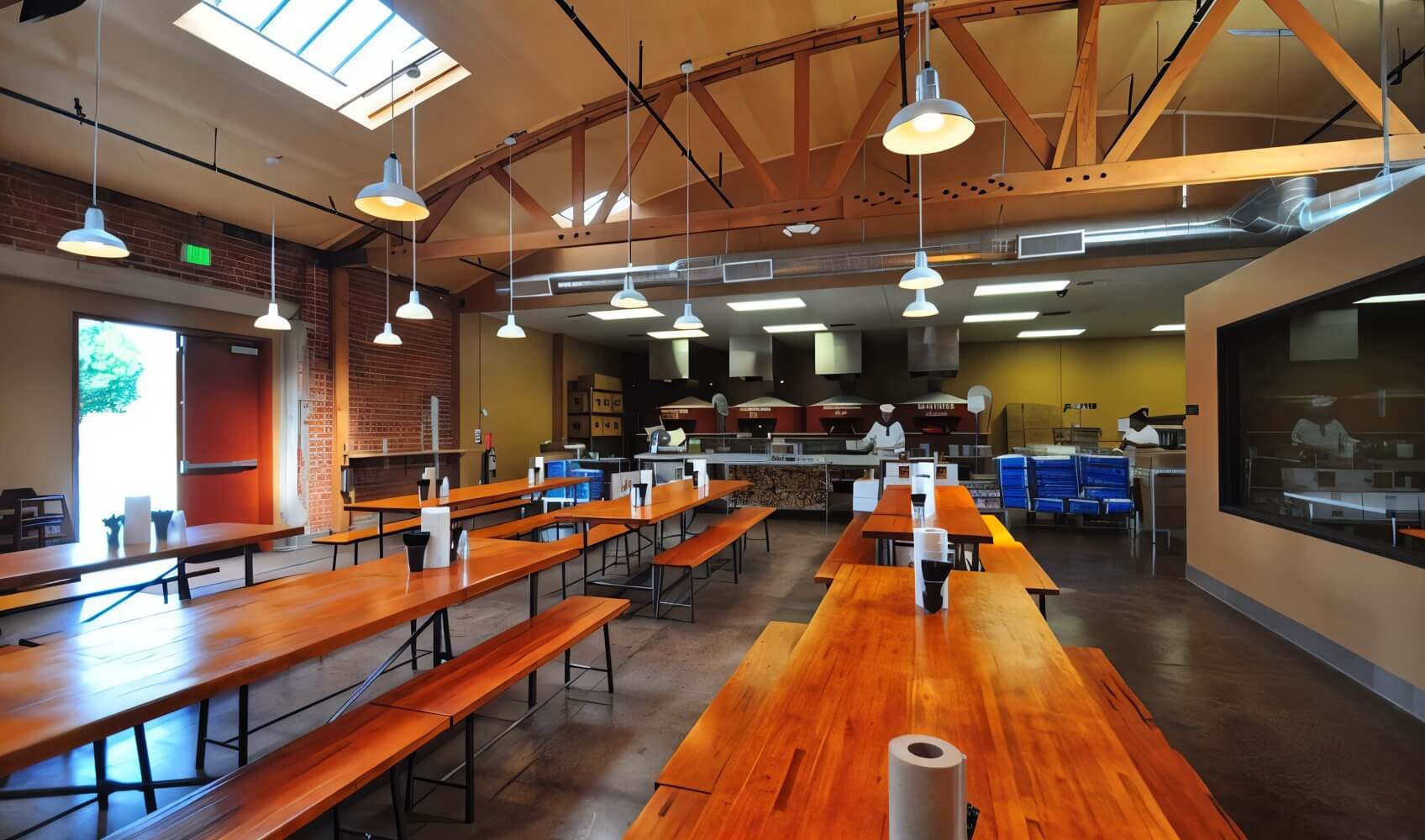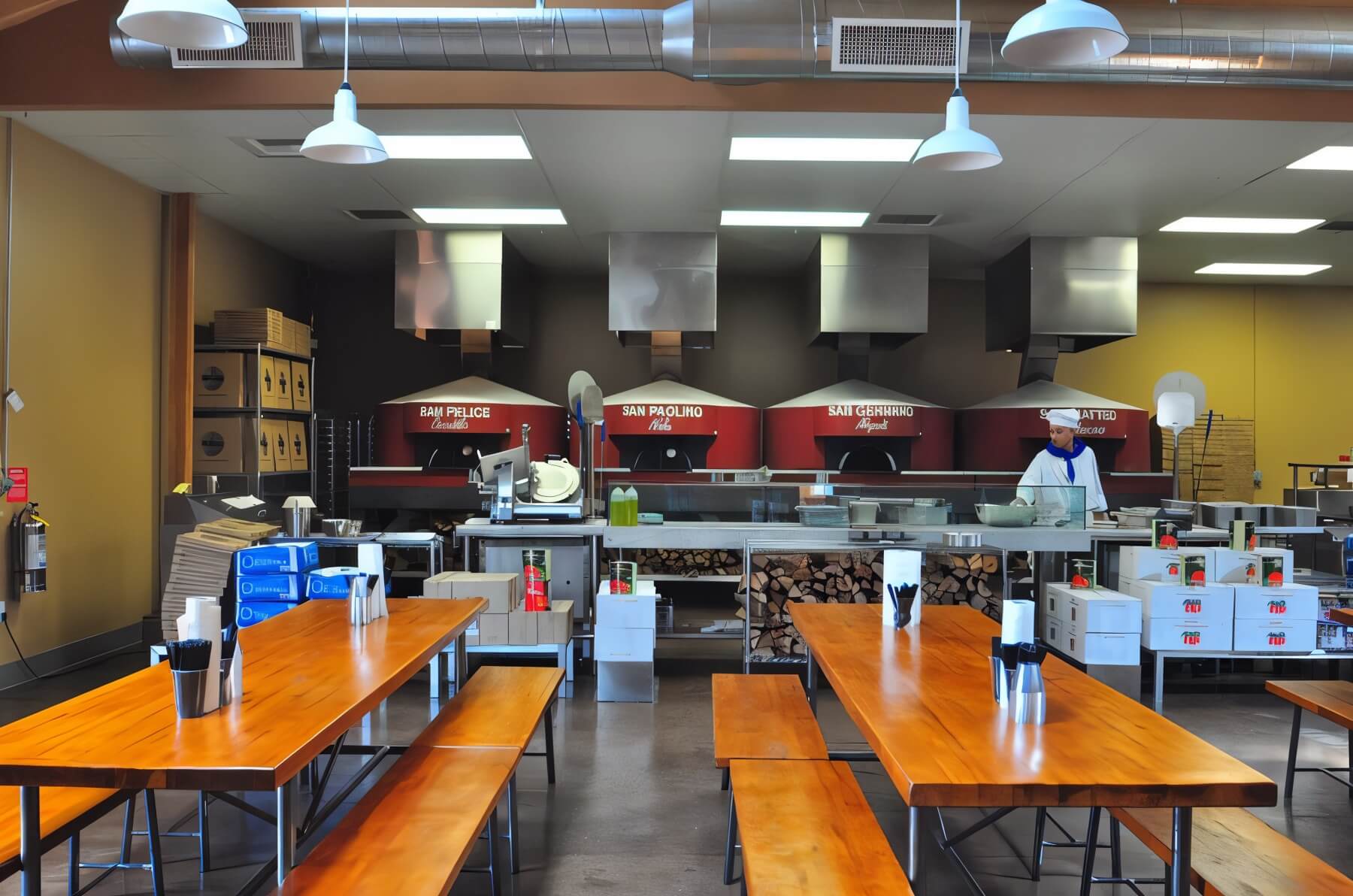 We preserved the 1950s steel trusses and polished the original concrete slab, then slid in three hand‑built Acunto ovens shipped from Naples, each tiled in volcanic stone and christened after patron saints. A glass‑walled dough room lets guests watch Caputo‑flour batches rise, while long communal tables, reclaimed‑pine service counters and a corner bar turn the 4,800 sq ft plan into a buzzing food hall. New roll‑up doors flood the space with daylight and connect directly to a covered patio.