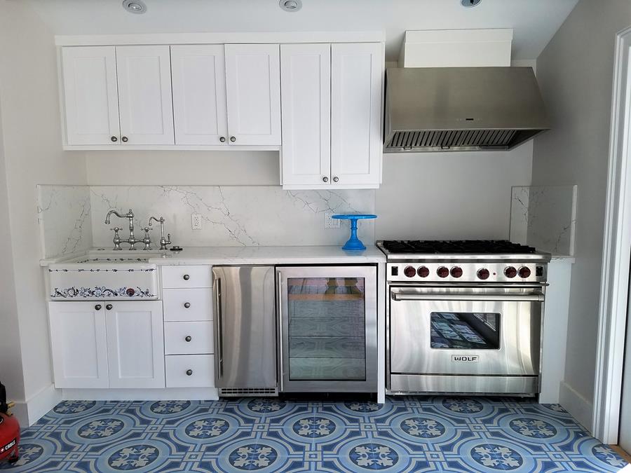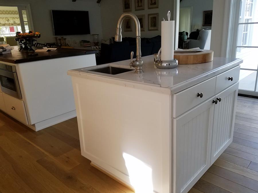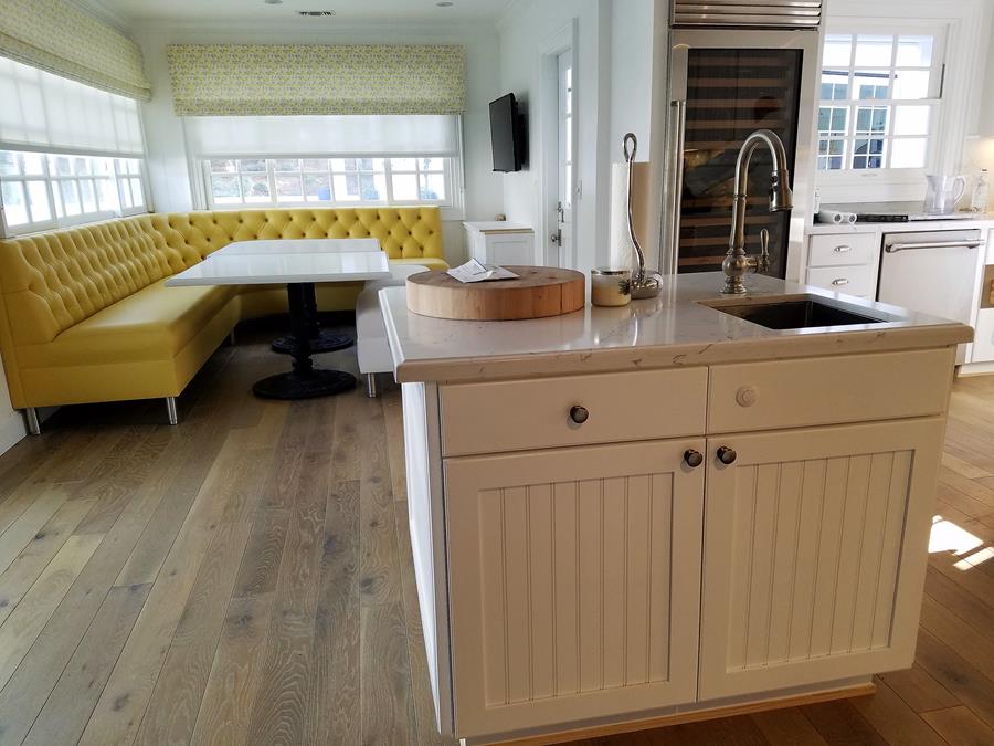 Behind the clean siding and grid-pattern patio lie new retaining walls, drainage, and native planting that stabilise the slope while carving out orchard paths and herb beds. Custom shaker cabinetry with oil-rubbed bronze hardware hides appliances, smart lighting, and HVAC — blending traditional charm with modern convenience. The pool deck integrates a slate-clad outdoor shower, BBQ island, and low-voltage lighting, all tied to a single smart-home hub. Careful value engineering — factory-finished siding, standard lumber, and repurposed fixtures — delivered the New-England aesthetic the owners wanted while keeping the schedule and budget intact.