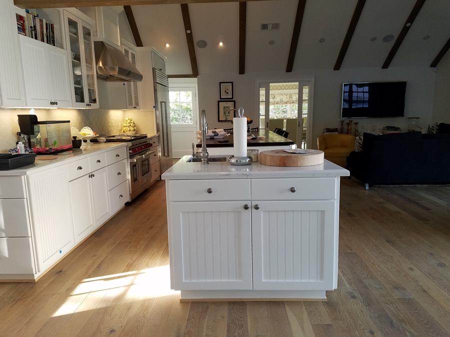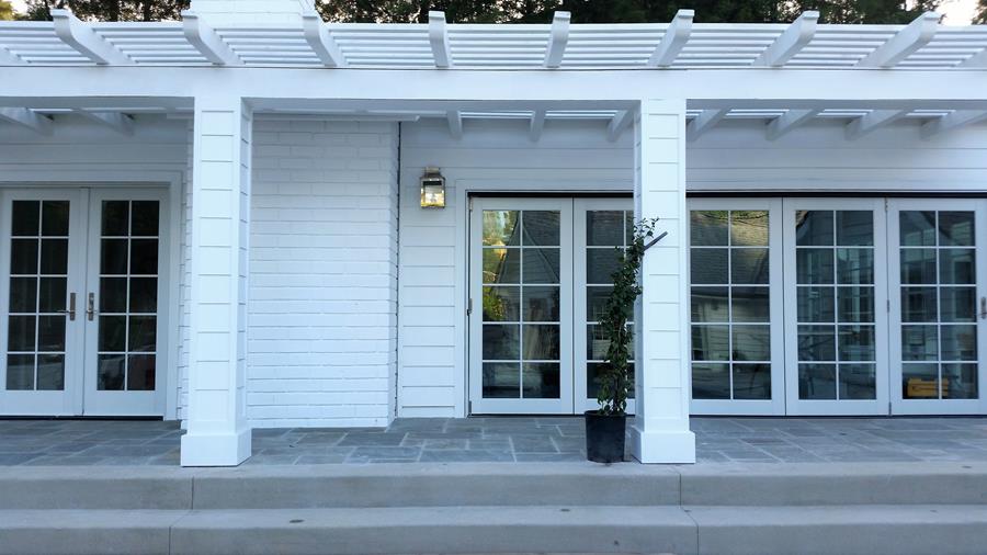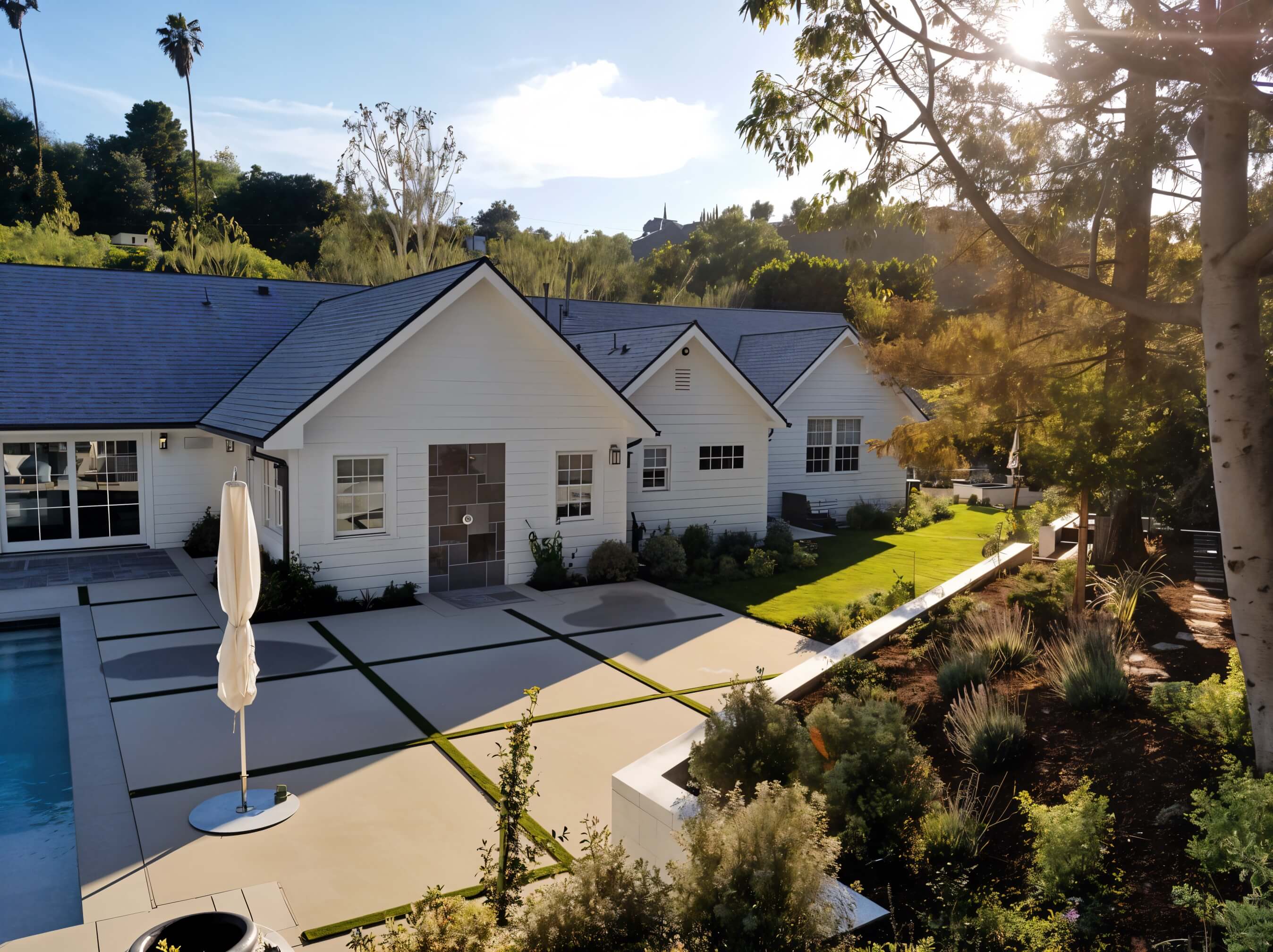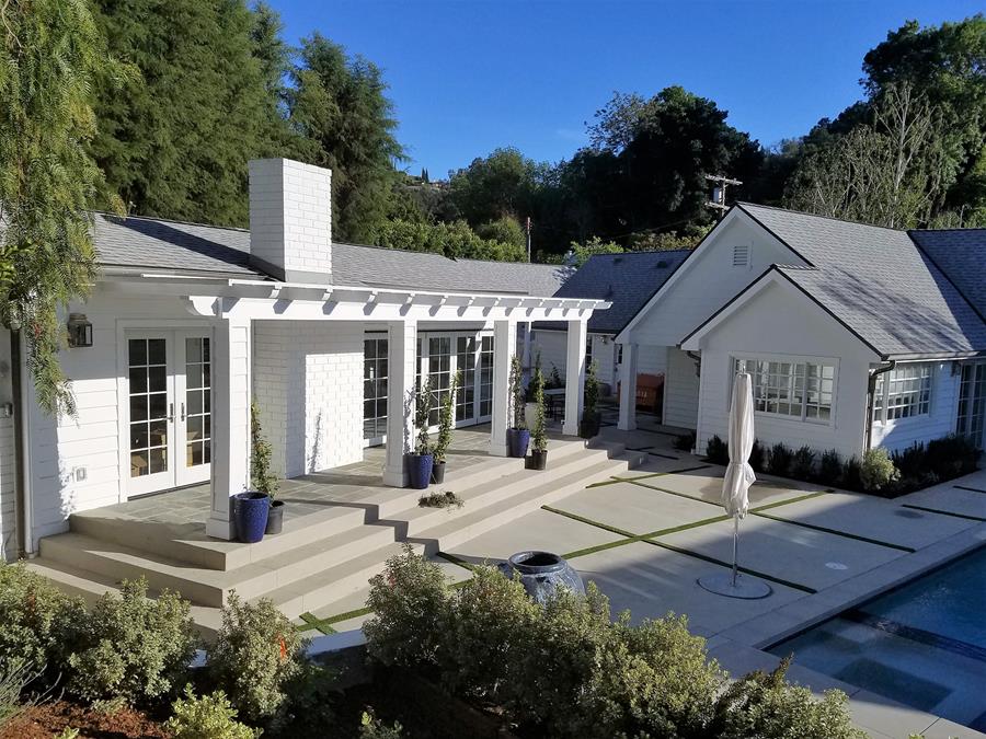 Athena added a 1 200 sq ft wing that houses a vaulted family room and primary suite, then gutted the original structure to install wide-plank oak floors, twin marble islands, and concealed high-efficiency systems. Walls of French doors now slide open to a courtyard pool framed by a pergola-shaded veranda and a rebuilt guest casita finished to match the main house.