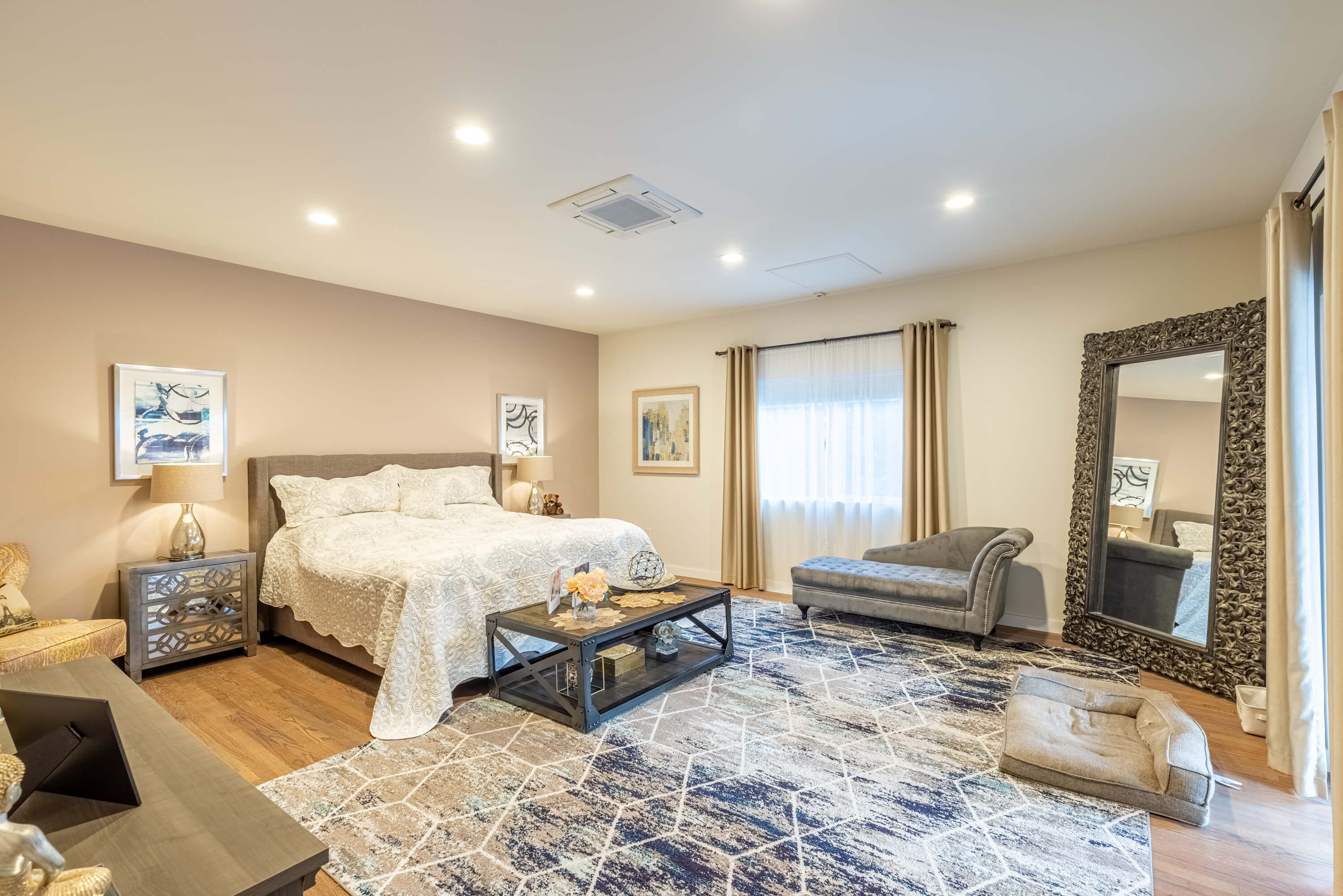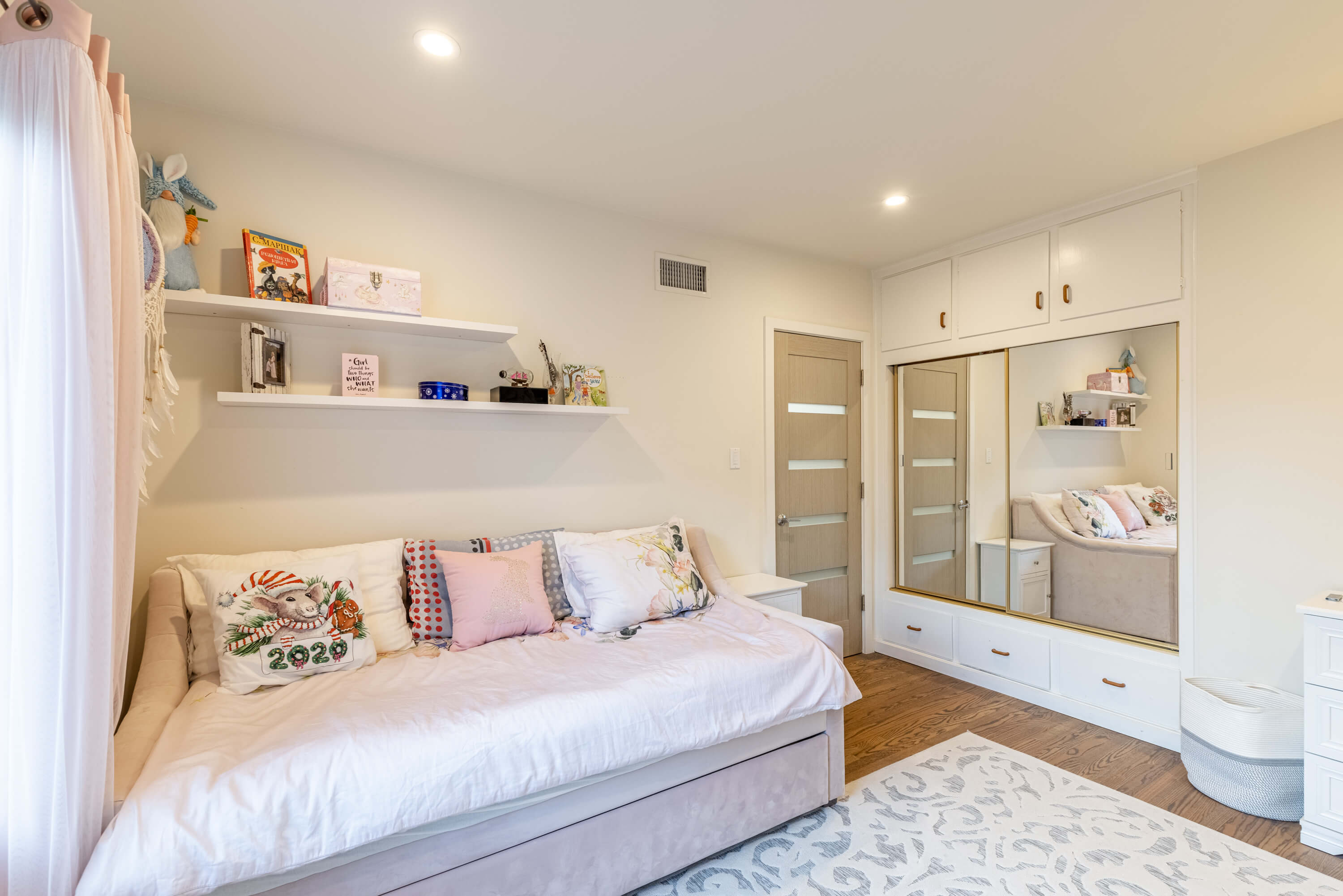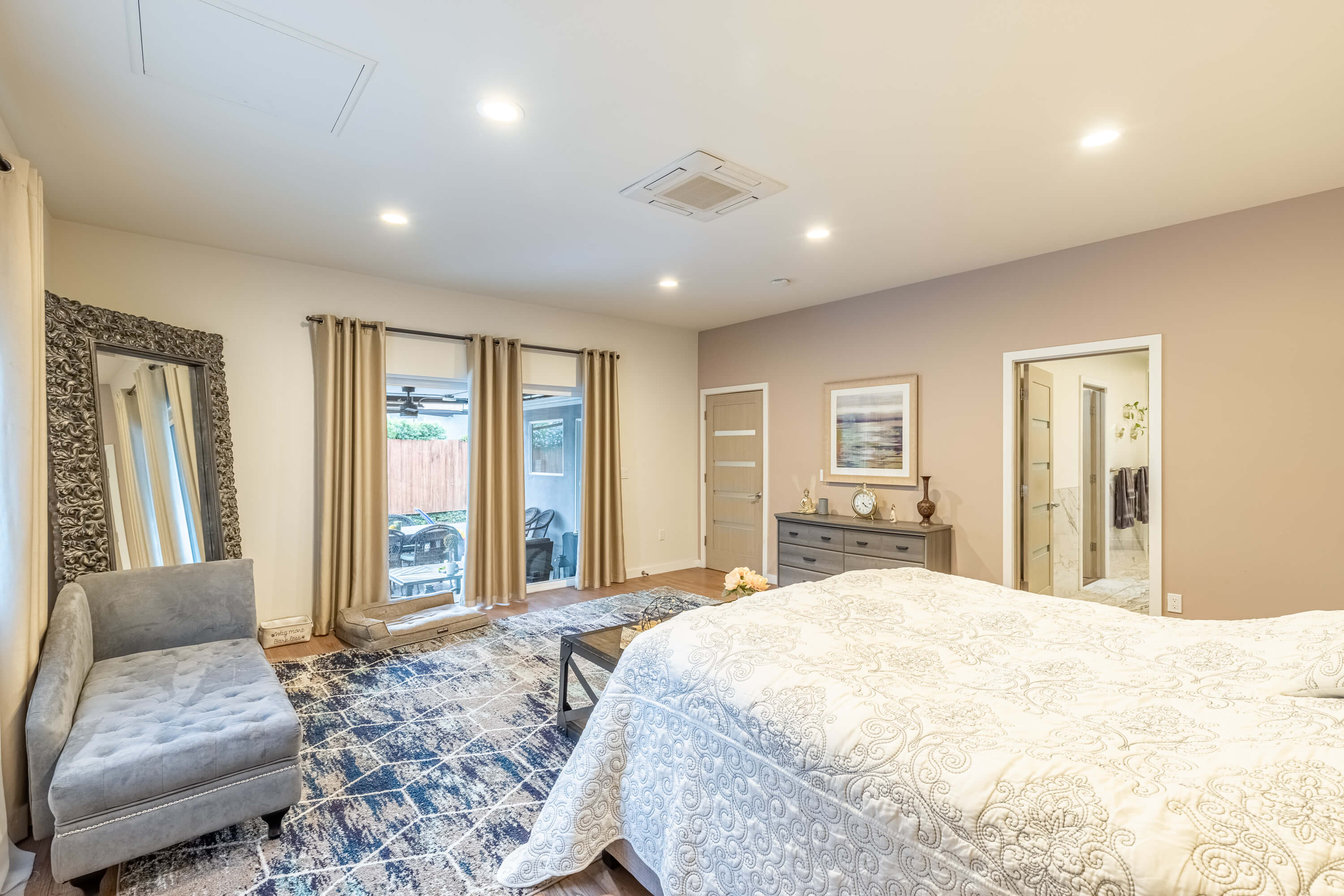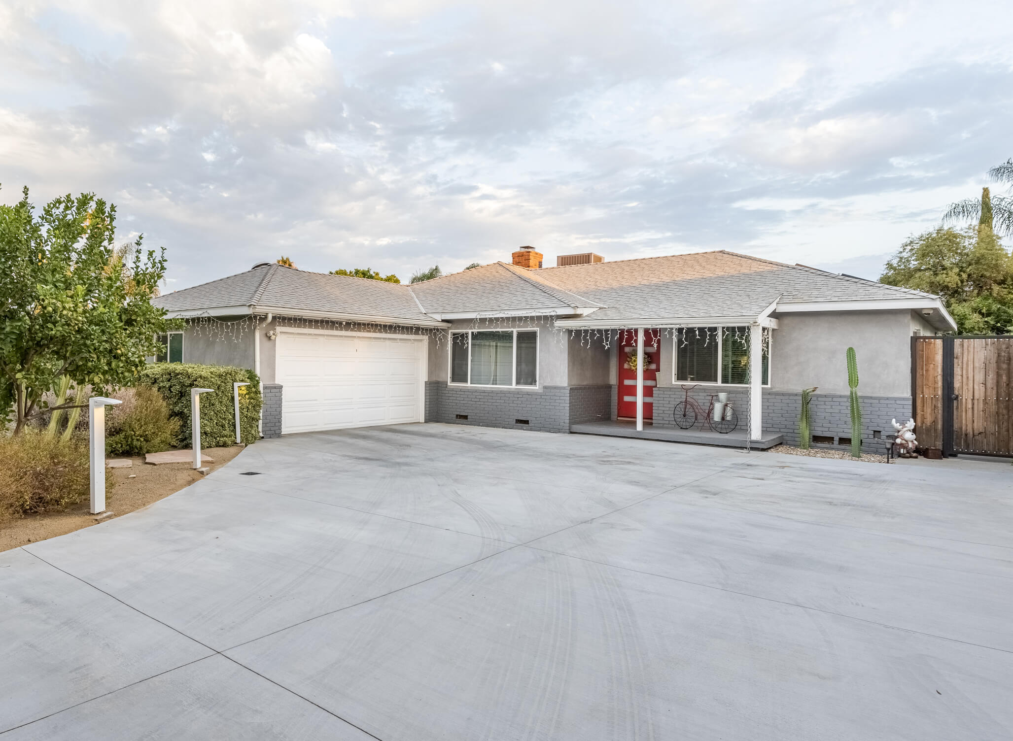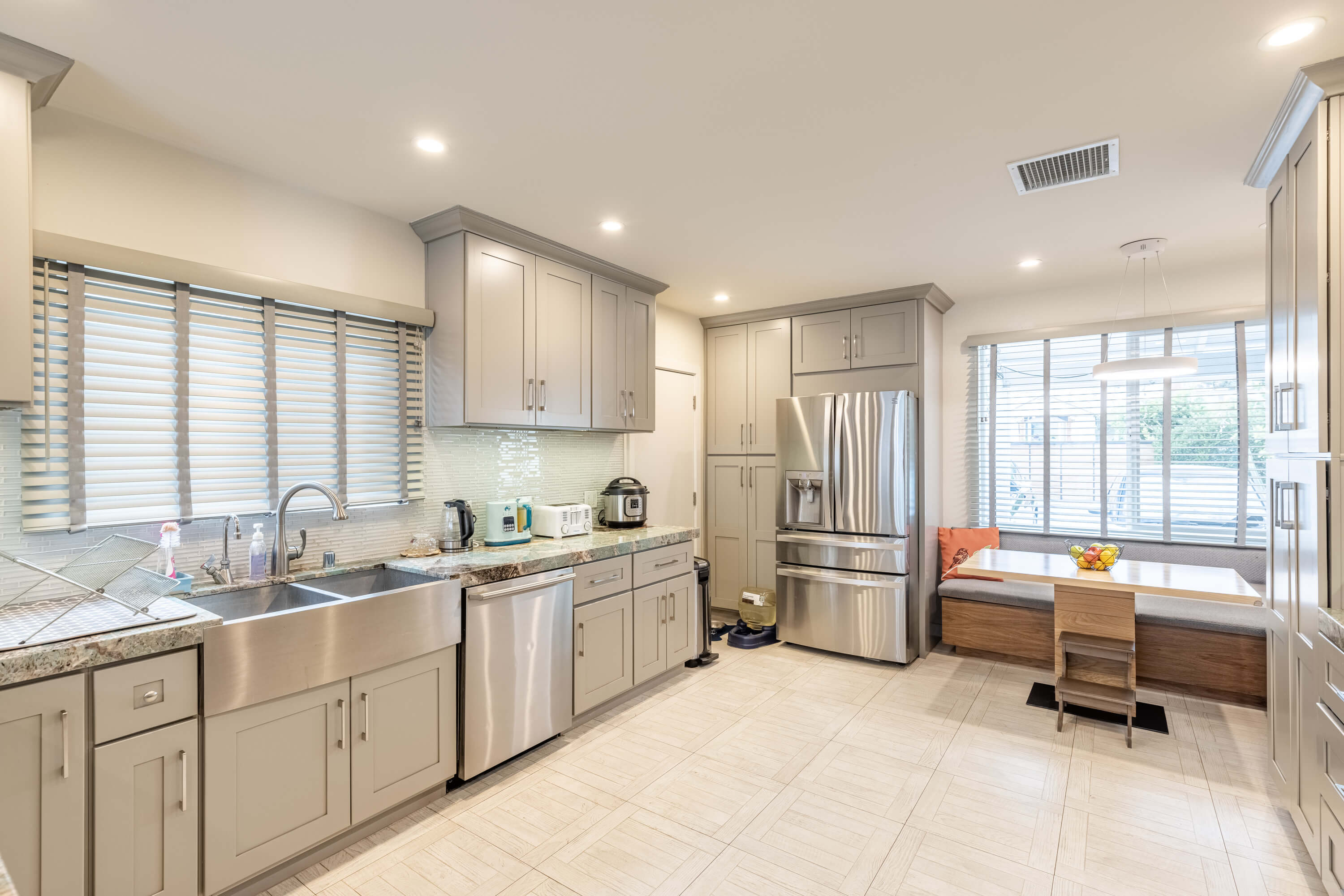 Athena stripped the house to studs, re-planned the layout and added a 400 sq ft master suite. Walls between kitchen, dining and living spaces came down, replaced by a steel beam that creates an open heart anchored by a stone-topped island and pro-grade range. New cedar-slat gates, a wide concrete apron and drought-tolerant planting give the street view fresh presence, while smooth-stucco façades tie old and new volumes together.