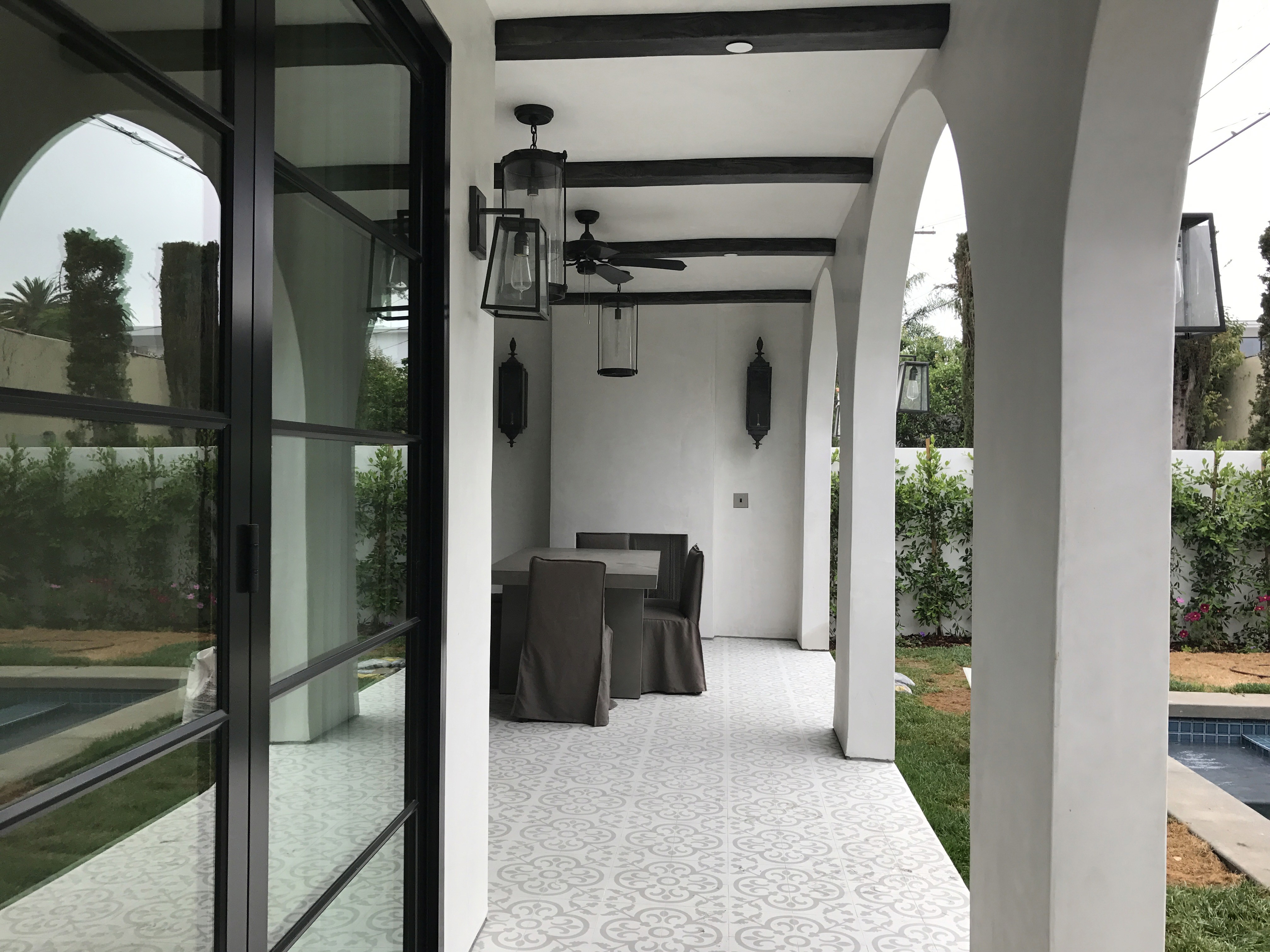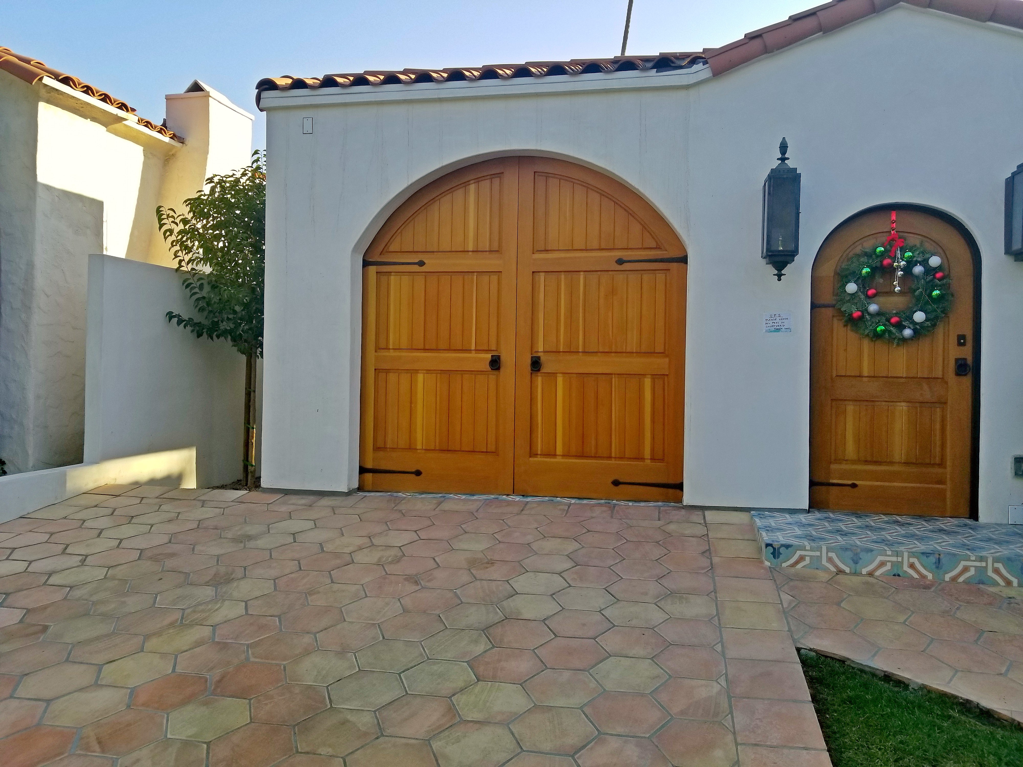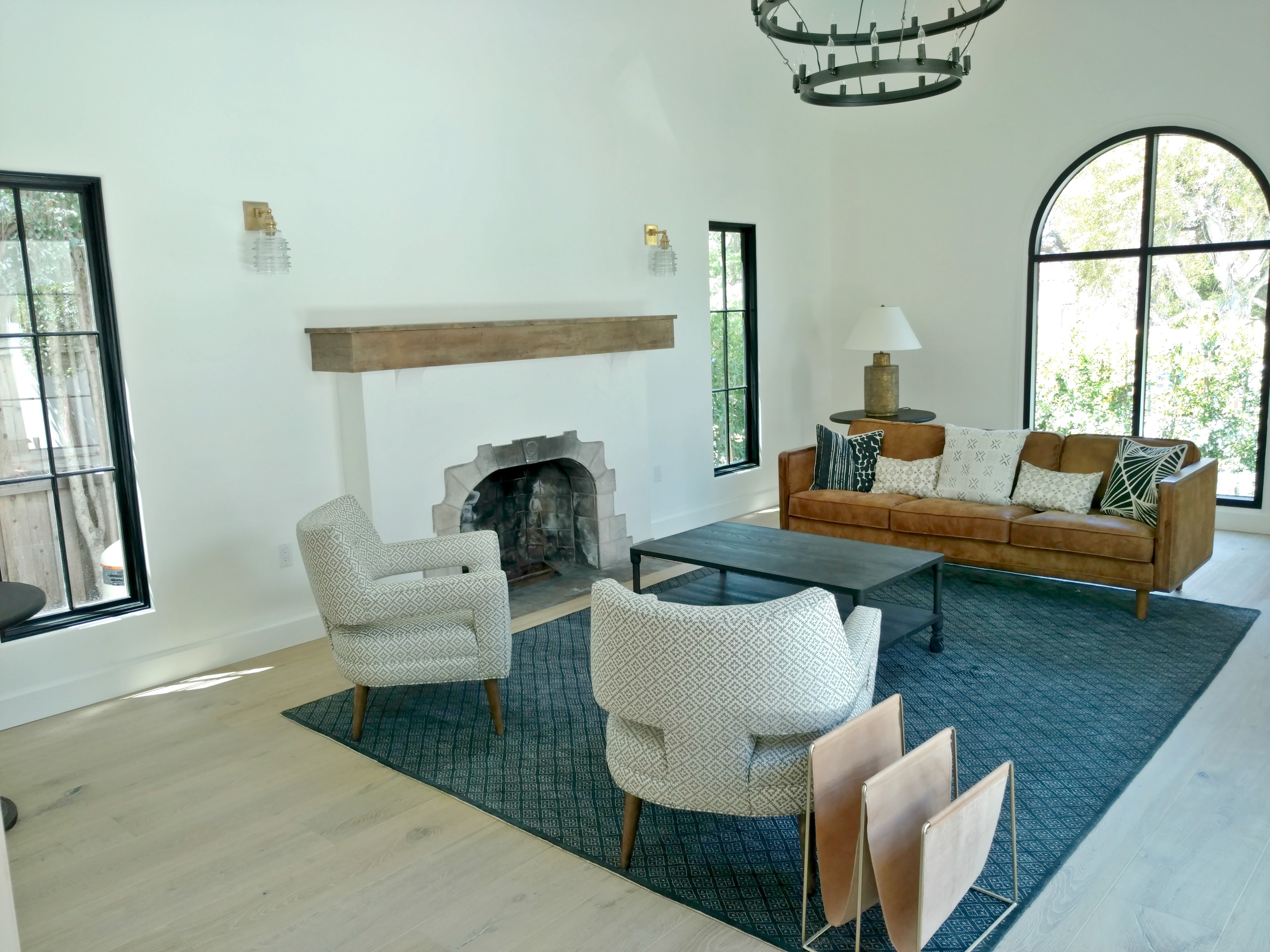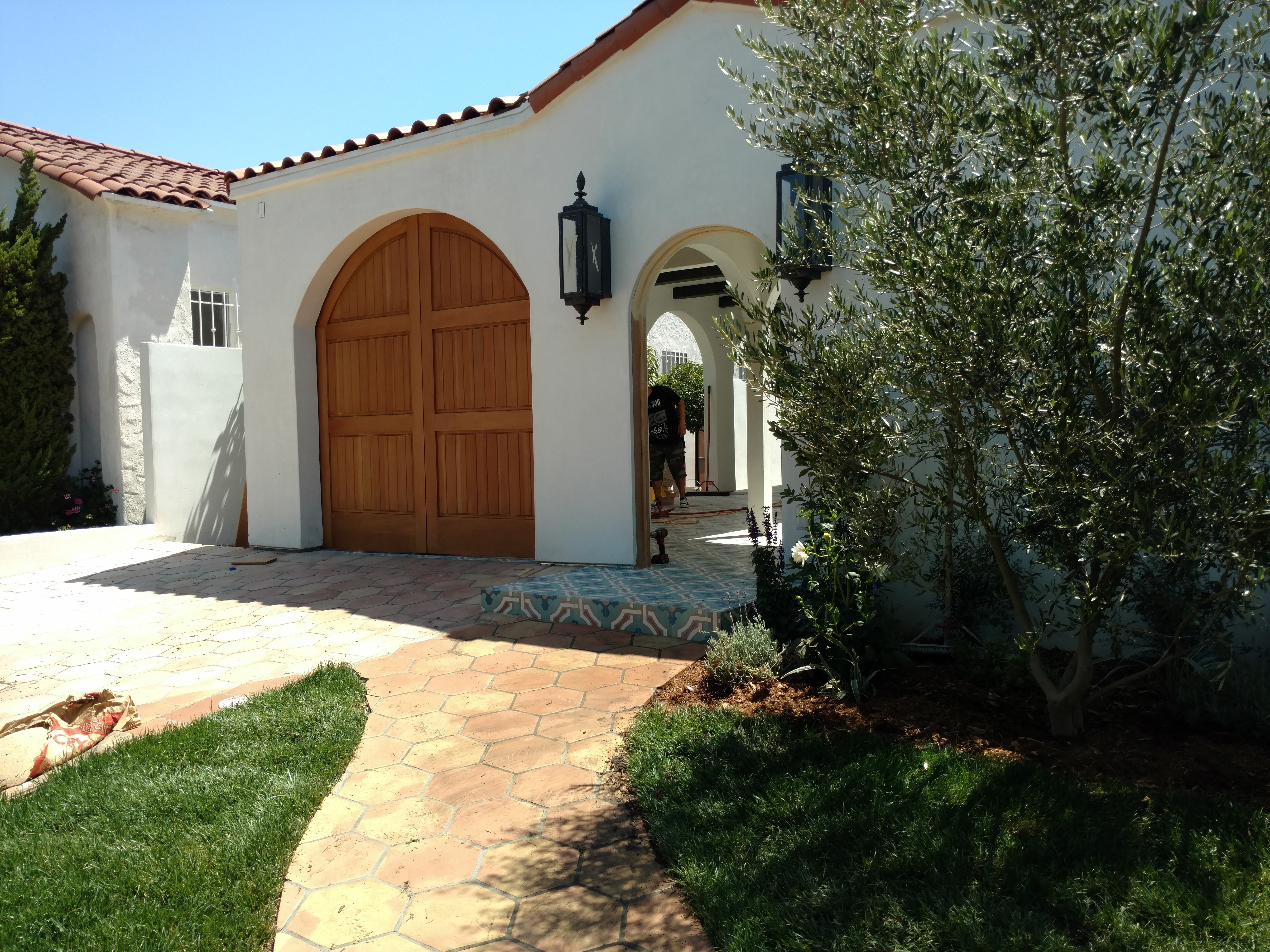 We extended the footprint with a vaulted great-room wing, inserted steel French doors and laid reclaimed hex-tile floors that carry out to the patio. A marble-clad chef’s kitchen anchors the open plan, while exposed ceiling beams, arched windows and hand-trowelled plaster preserve period character. Outside, cedar carriage doors, wrought-iron gates and a terracotta motor court set a warm first impression.