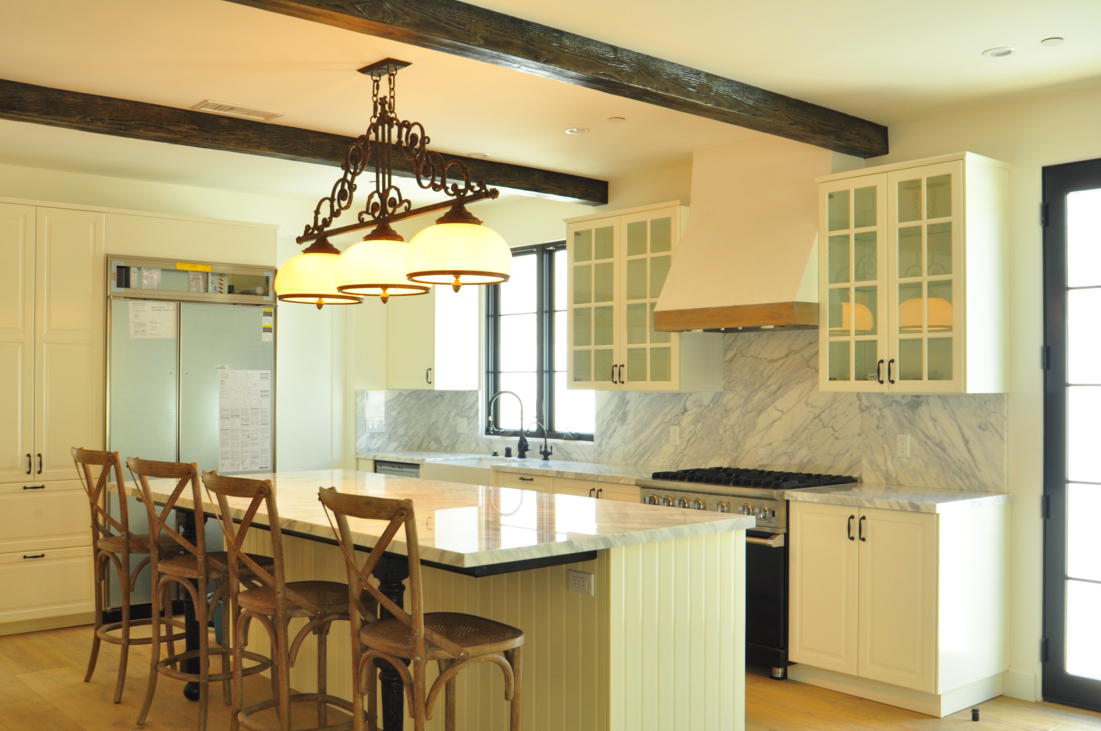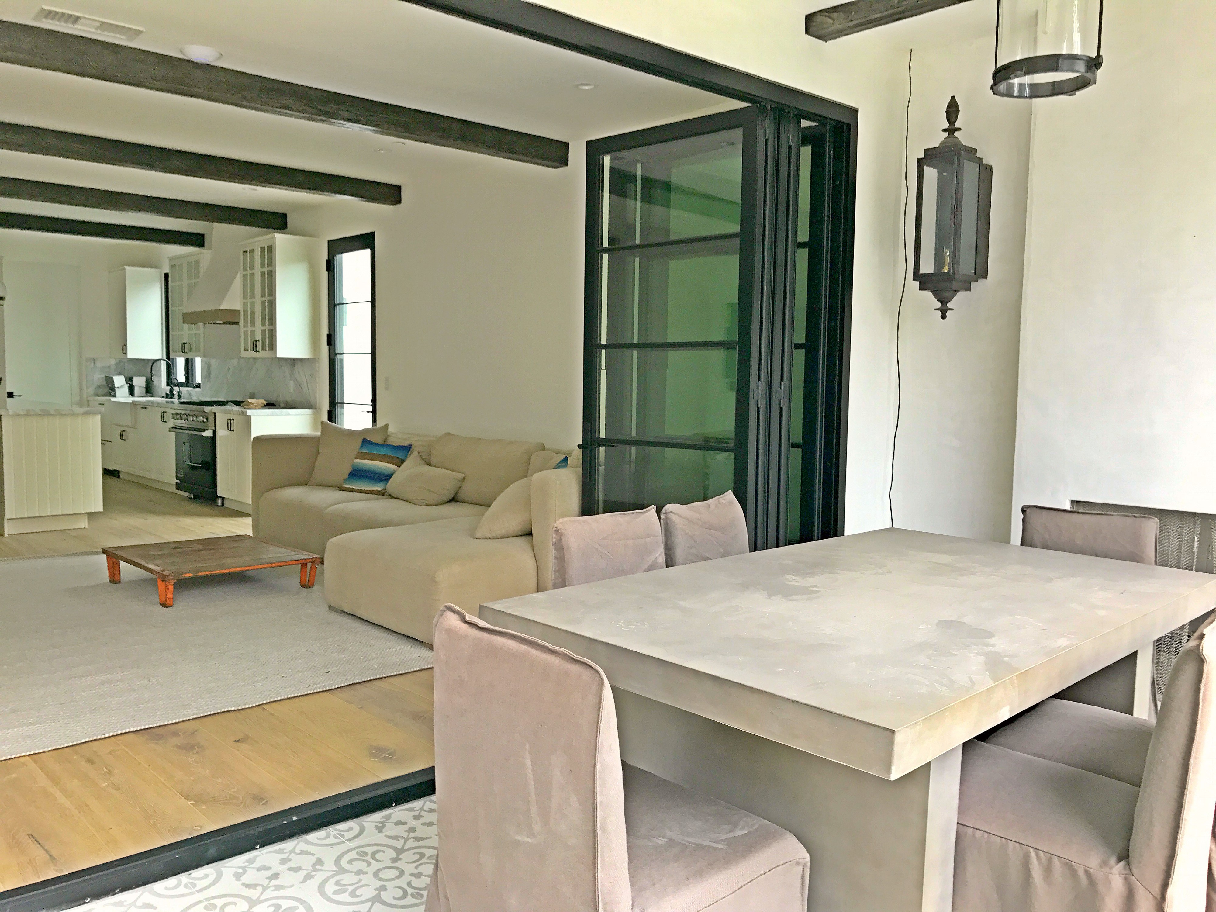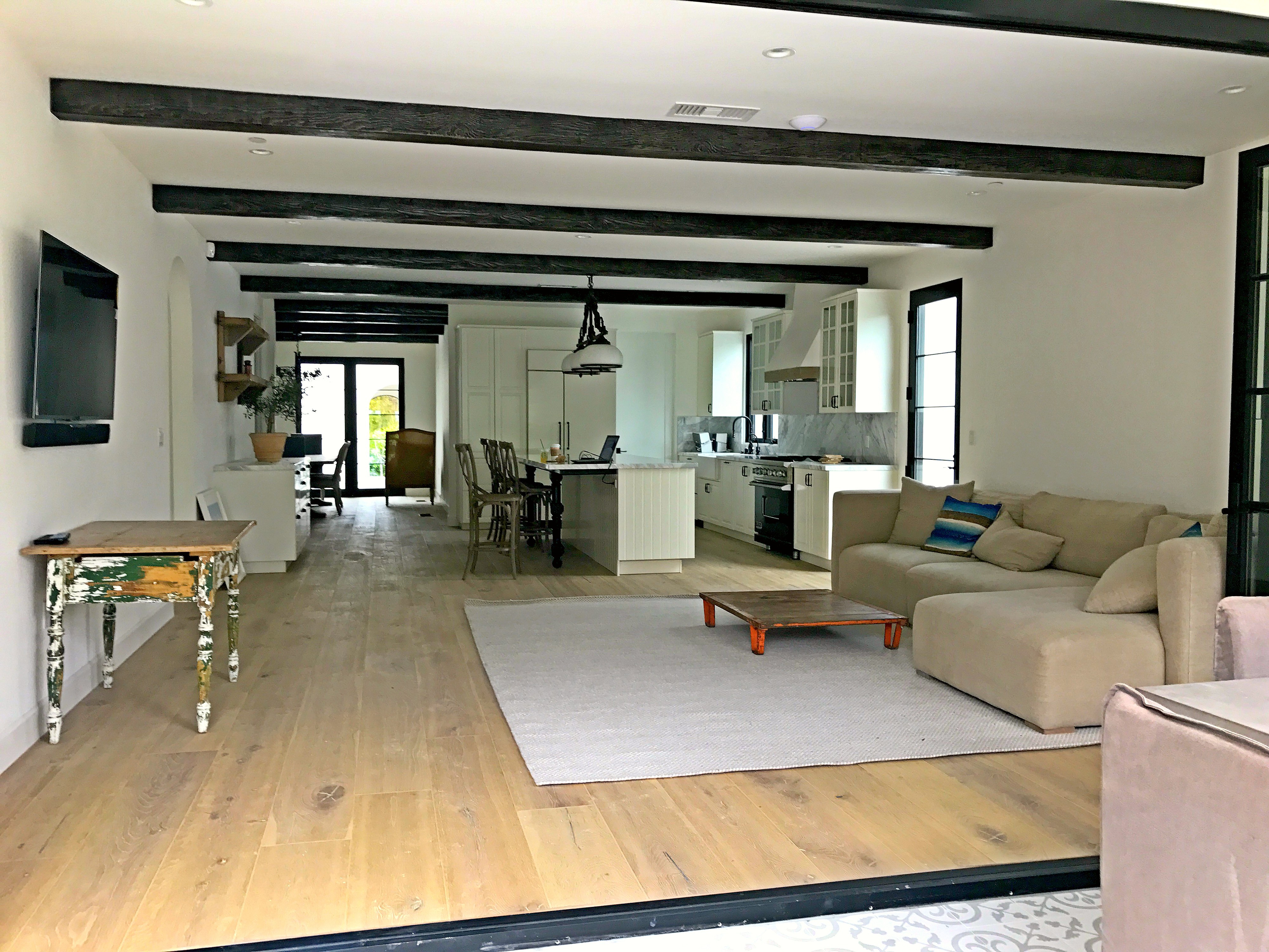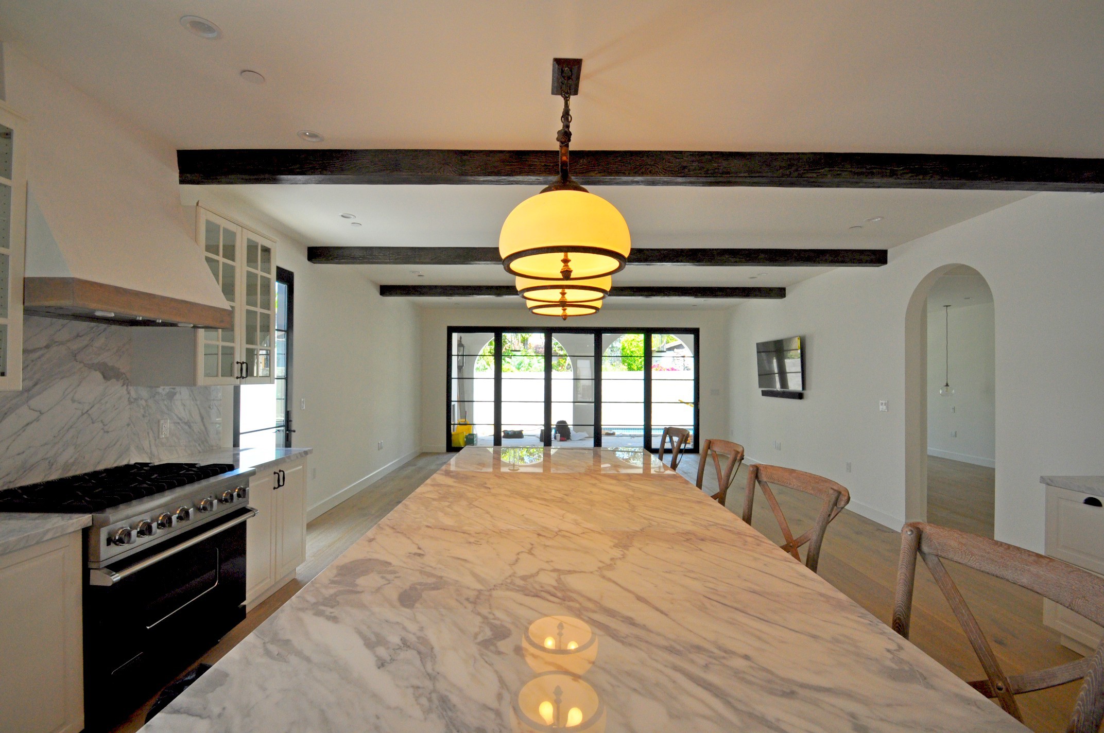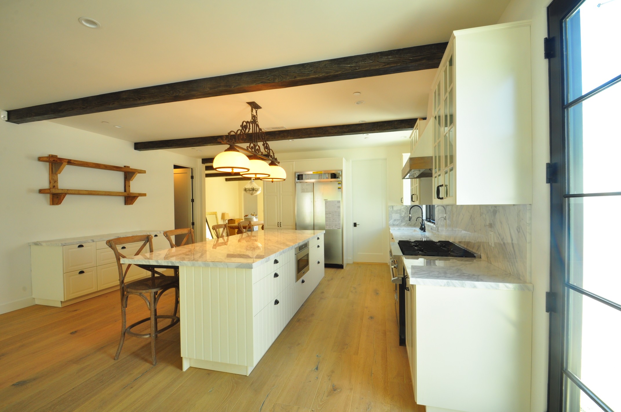 We extended the footprint with a vaulted great-room wing, inserted steel French doors and laid reclaimed hex-tile floors that carry out to the patio. A marble-clad chef’s kitchen anchors the open plan, while exposed ceiling beams, arched windows and hand-trowelled plaster preserve period character. Outside, cedar carriage doors, wrought-iron gates and a terracotta motor court set a warm first impression.