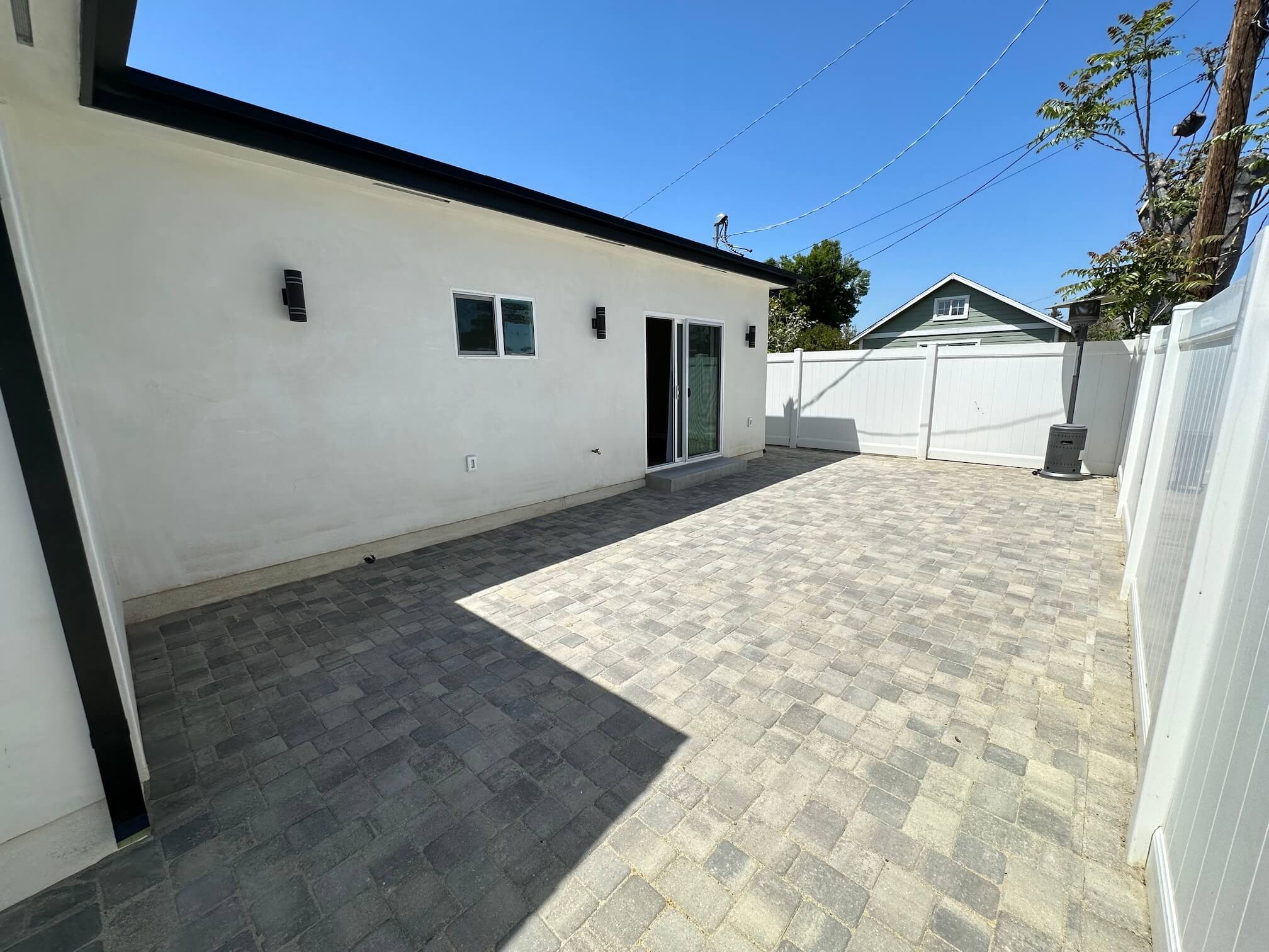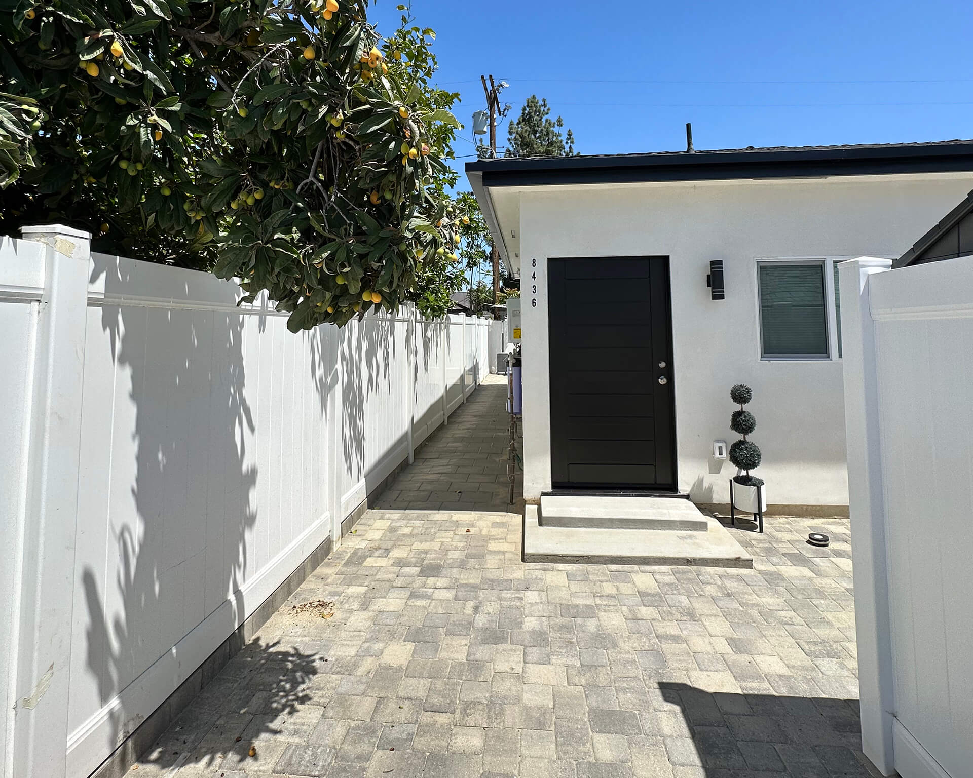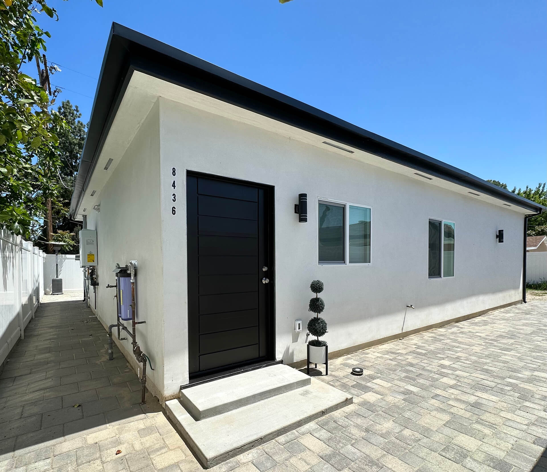 Exterior stucco, black fascia and flush LED sconces echo the main house, but a dedicated address, tankless water heater and whole-house filtration give the ADU true stand-alone comfort. Permeable pavers handle stormwater, and routed utilities were sleeved under new walkways — minimizing disruption to the existing landscape and owners alike.