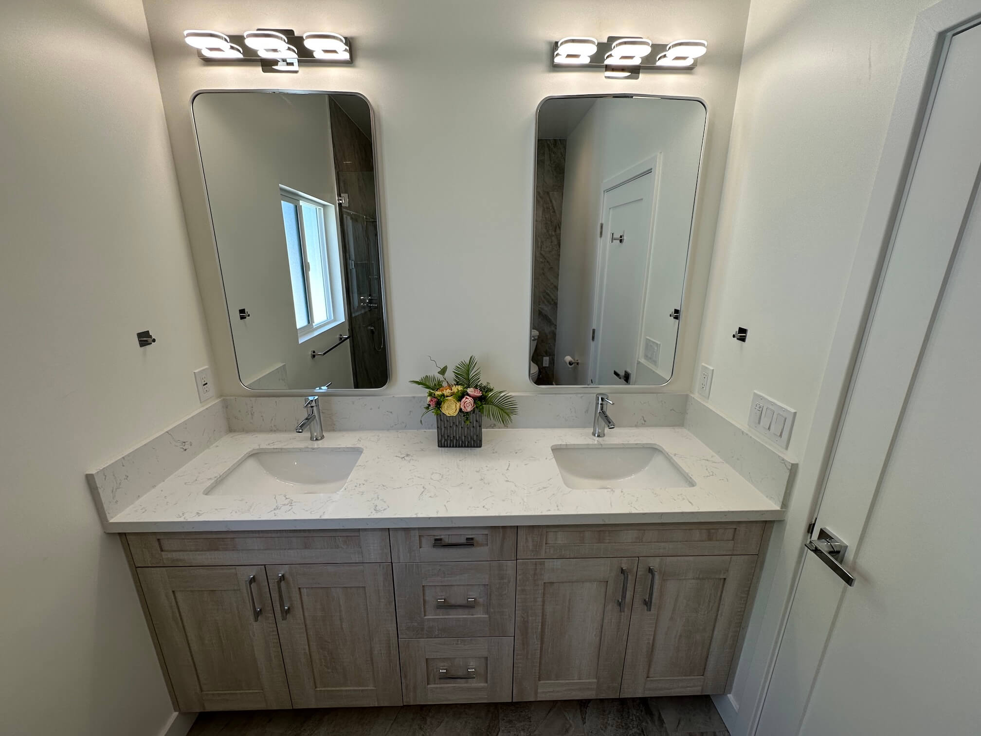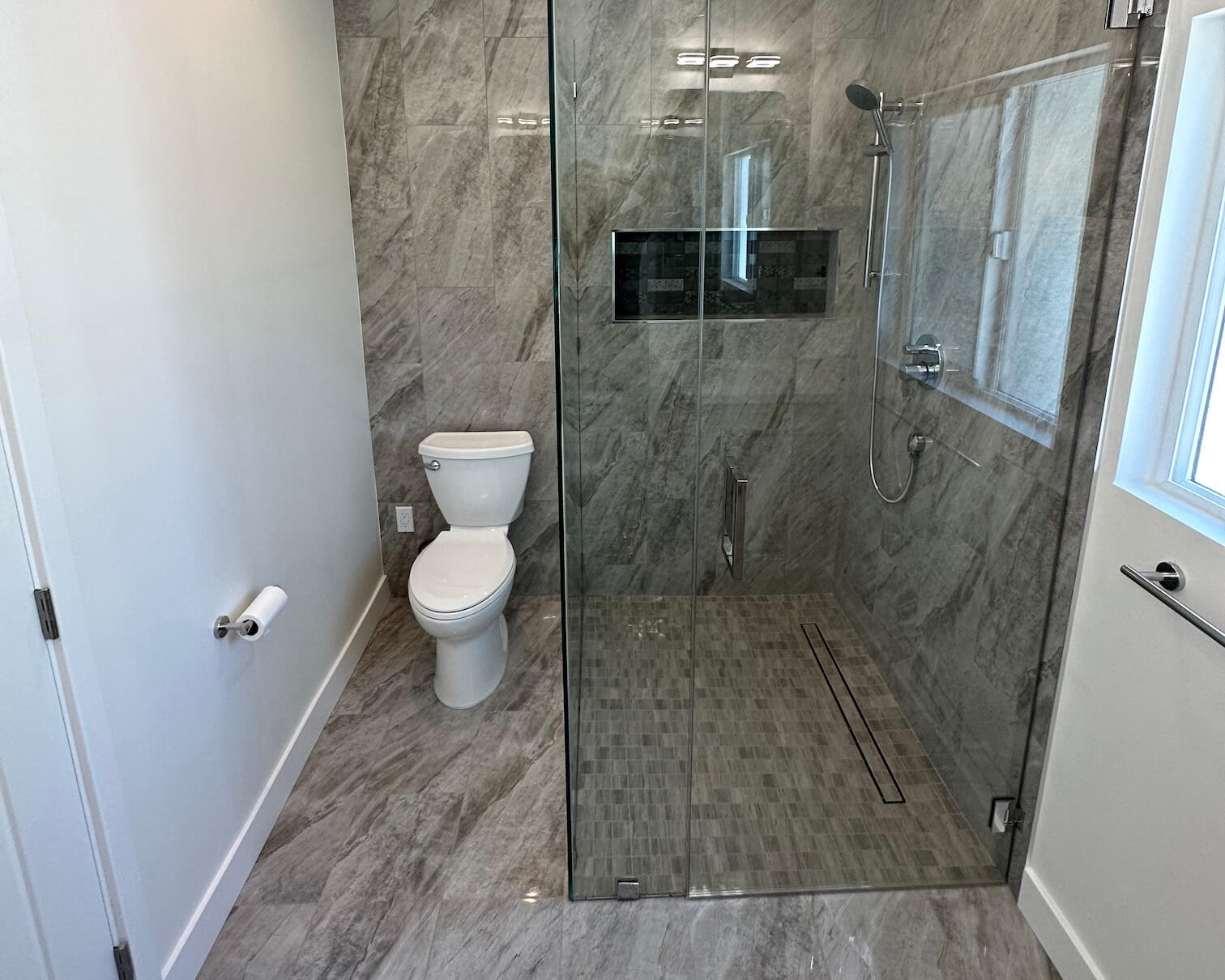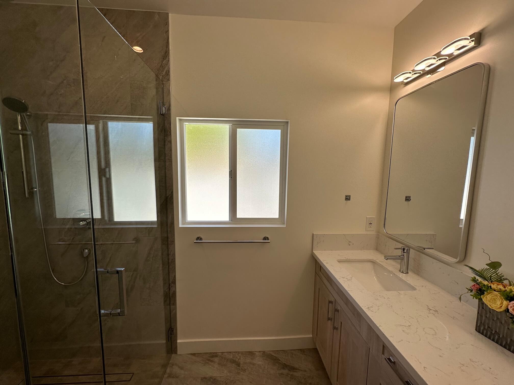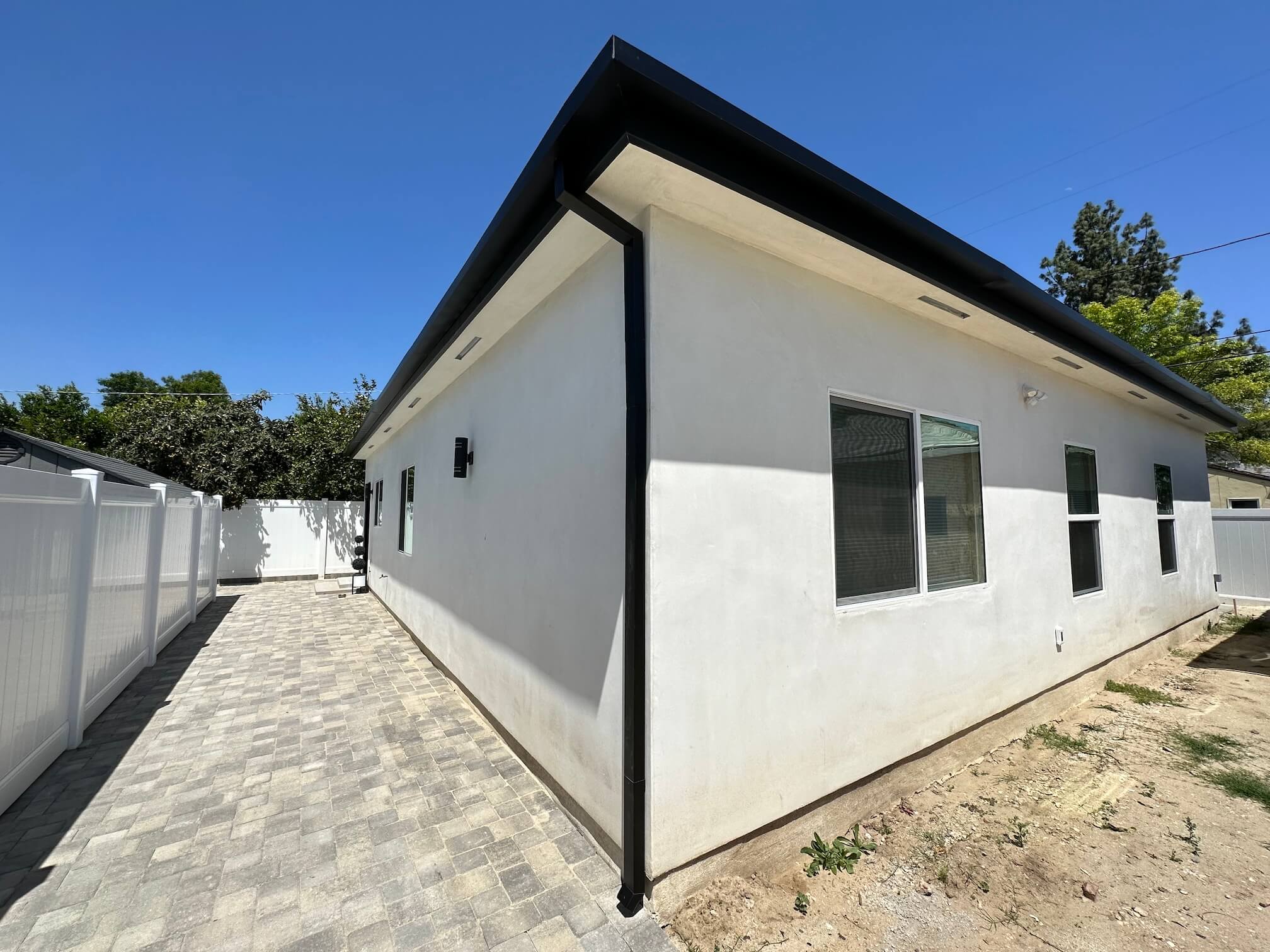 Exterior stucco, black fascia and flush LED sconces echo the main house, but a dedicated address, tankless water heater and whole-house filtration give the ADU true stand-alone comfort. Permeable pavers handle stormwater, and routed utilities were sleeved under new walkways — minimizing disruption to the existing landscape and owners alike.