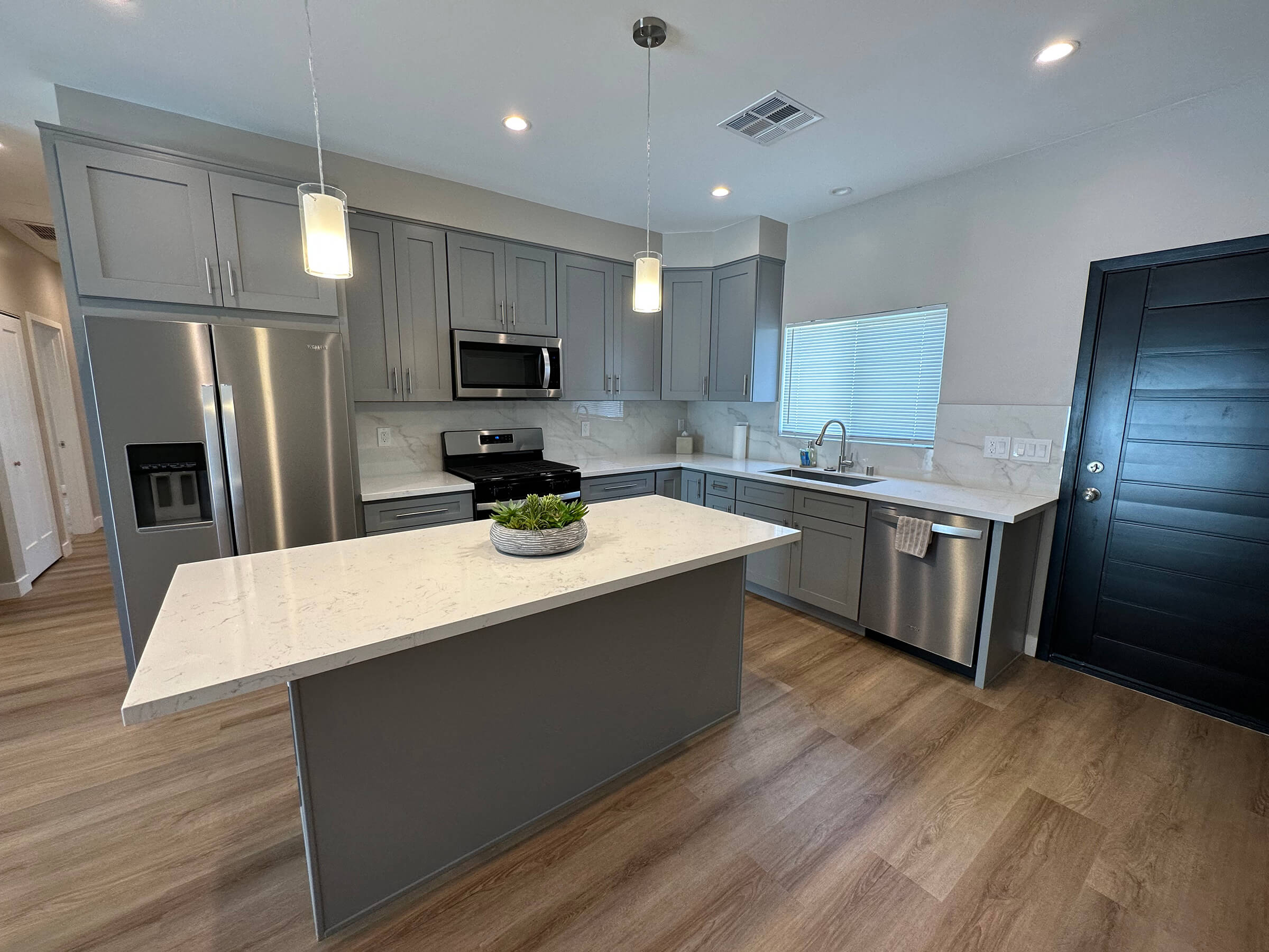 An oversized island anchors the open kitchen, pairing shaker cabinetry with Calacatta-look tops and a full-height porcelain splash. Energy-Star appliances, recessed LEDs and ducted mini-split HVAC keep the interior efficient and clutter-free, while sliding glass doors draw the living space onto a private paver patio.