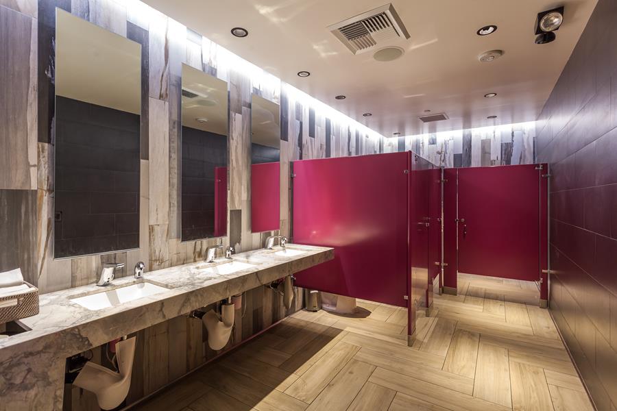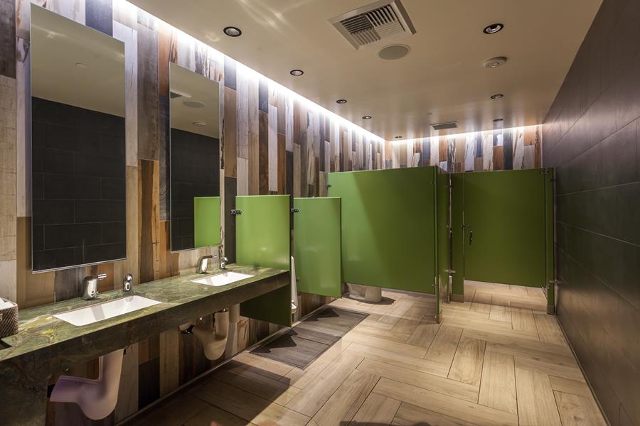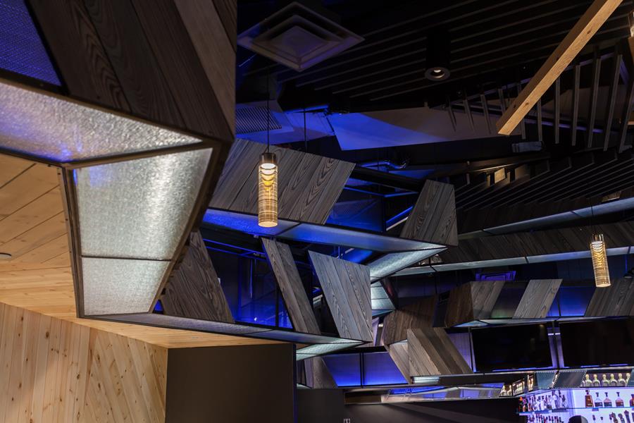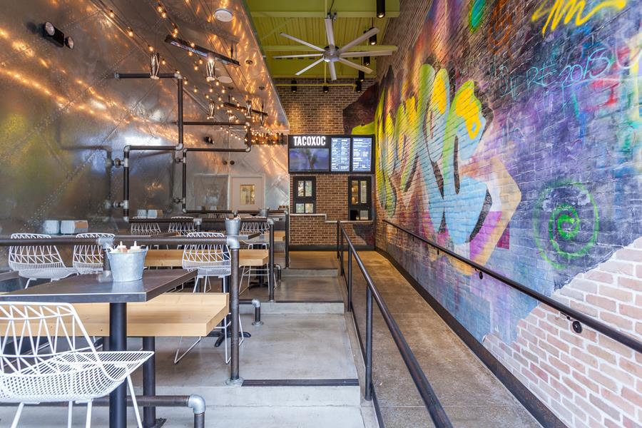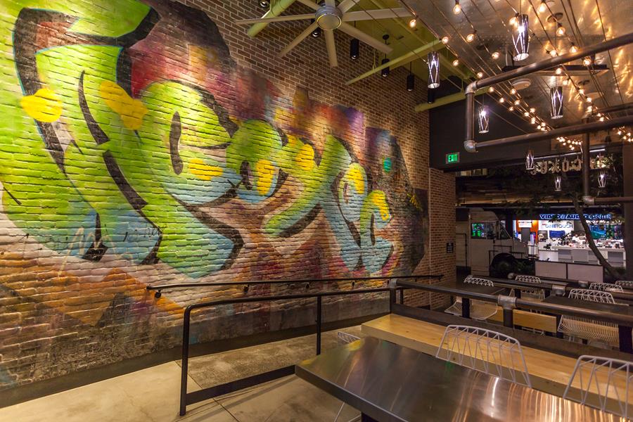 Athena converted a raw retail shell at Westfield’s Village into a 3,000 sq.ft. eat-drink hub. A cantilevered tequila bar — all back-lit glass and polished brass — anchors the space, while floor-to-ceiling sliders erase the boundary between the stepped patio and the mural-splashed dining room. Durable concrete, riveted metal panels and lime-green shiplap create an urban palette that lets the colorful art and cocktails pop.