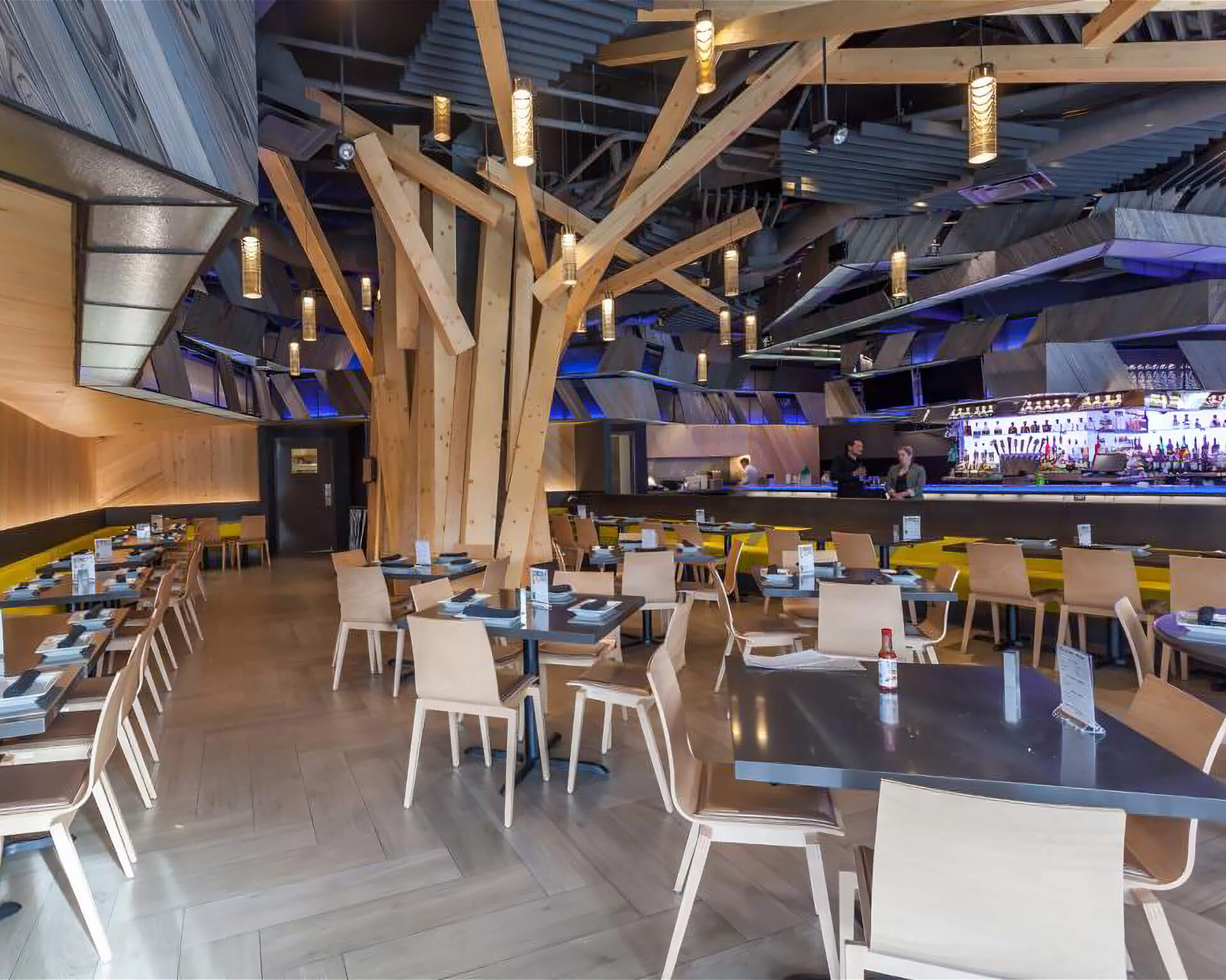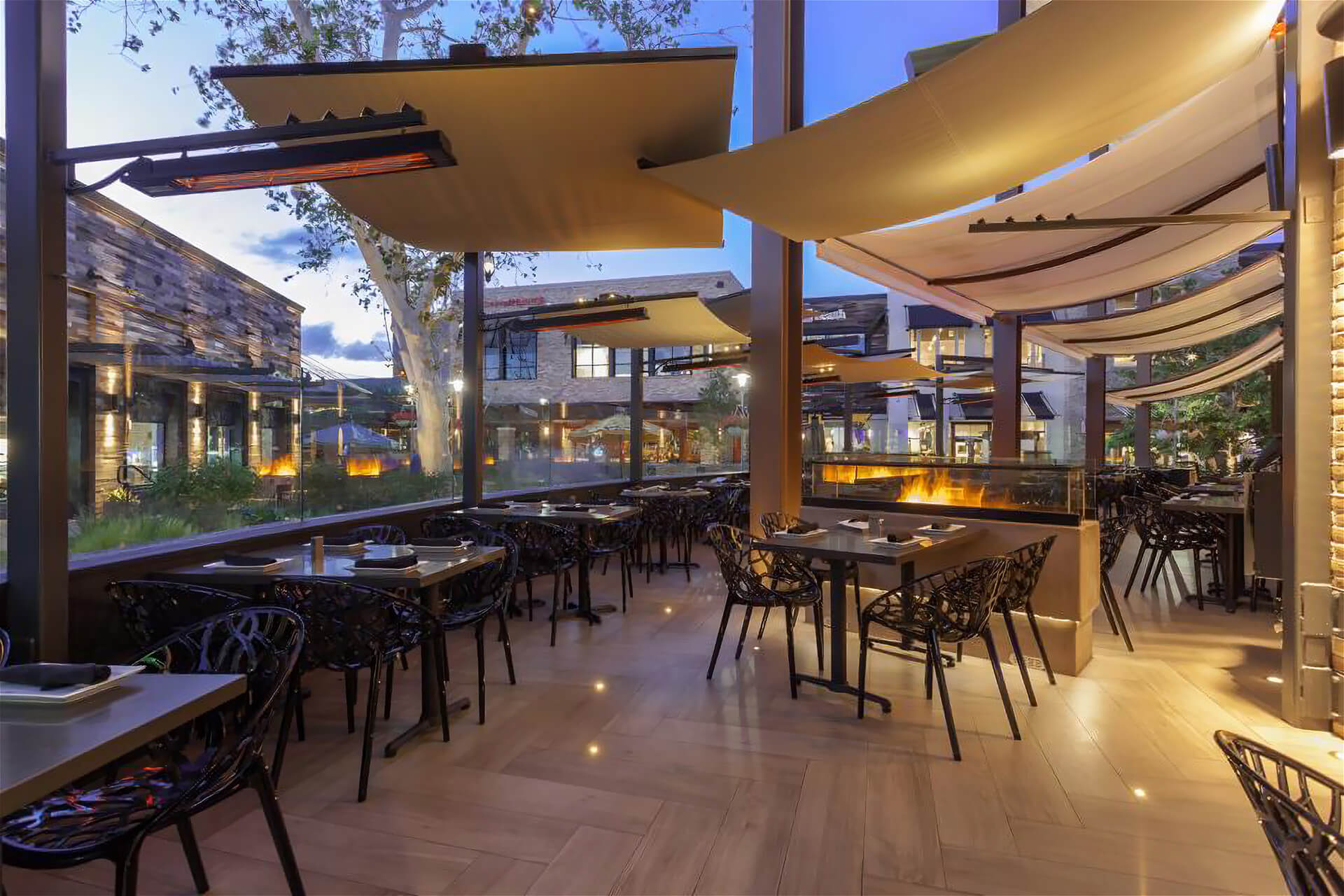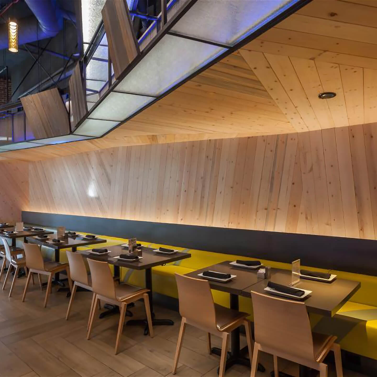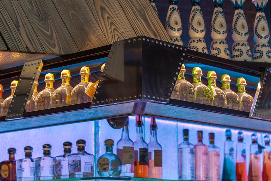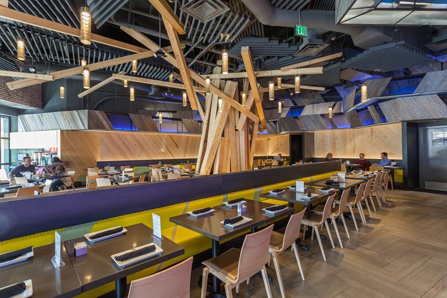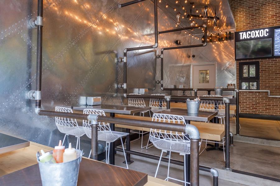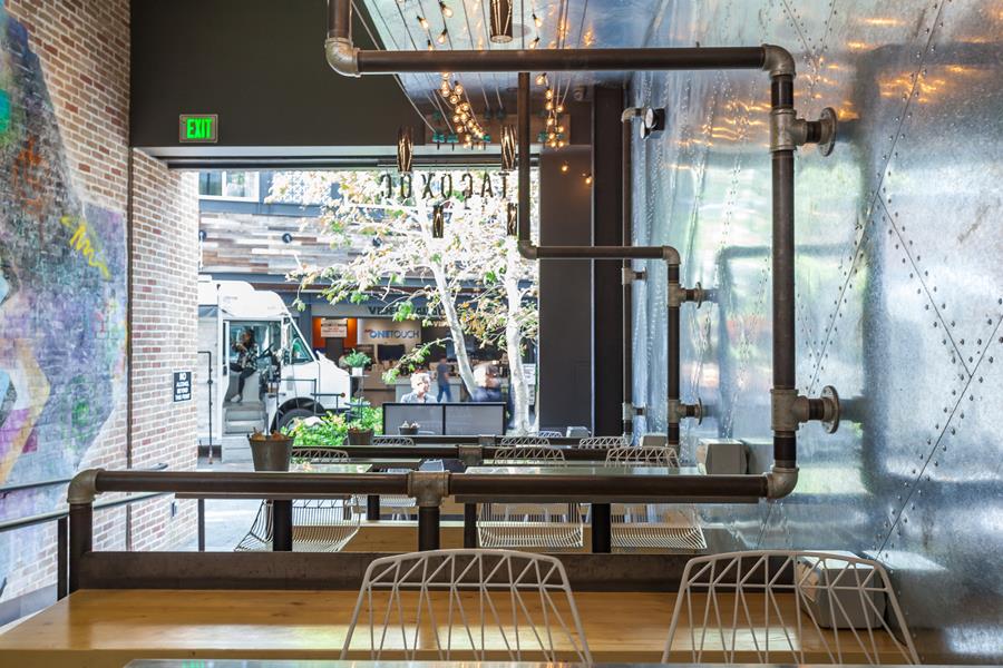 Back-of-house circulation follows a U-shaped loop that speeds takeaway orders without disrupting seated guests, and a demand-ventilation hood keeps the open kitchen cool during the evening rush. Tiered banquettes framed in industrial piping give every table a courtyard view; overhead, string lights and oversize ceiling fans temper warm Valley nights. All mechanical and grease-duct runs were threaded through the steel joists early in the build-out — a move that preserved the 18-foot ceiling and allowed the design team to float the bar’s LED halo without visual clutter.
